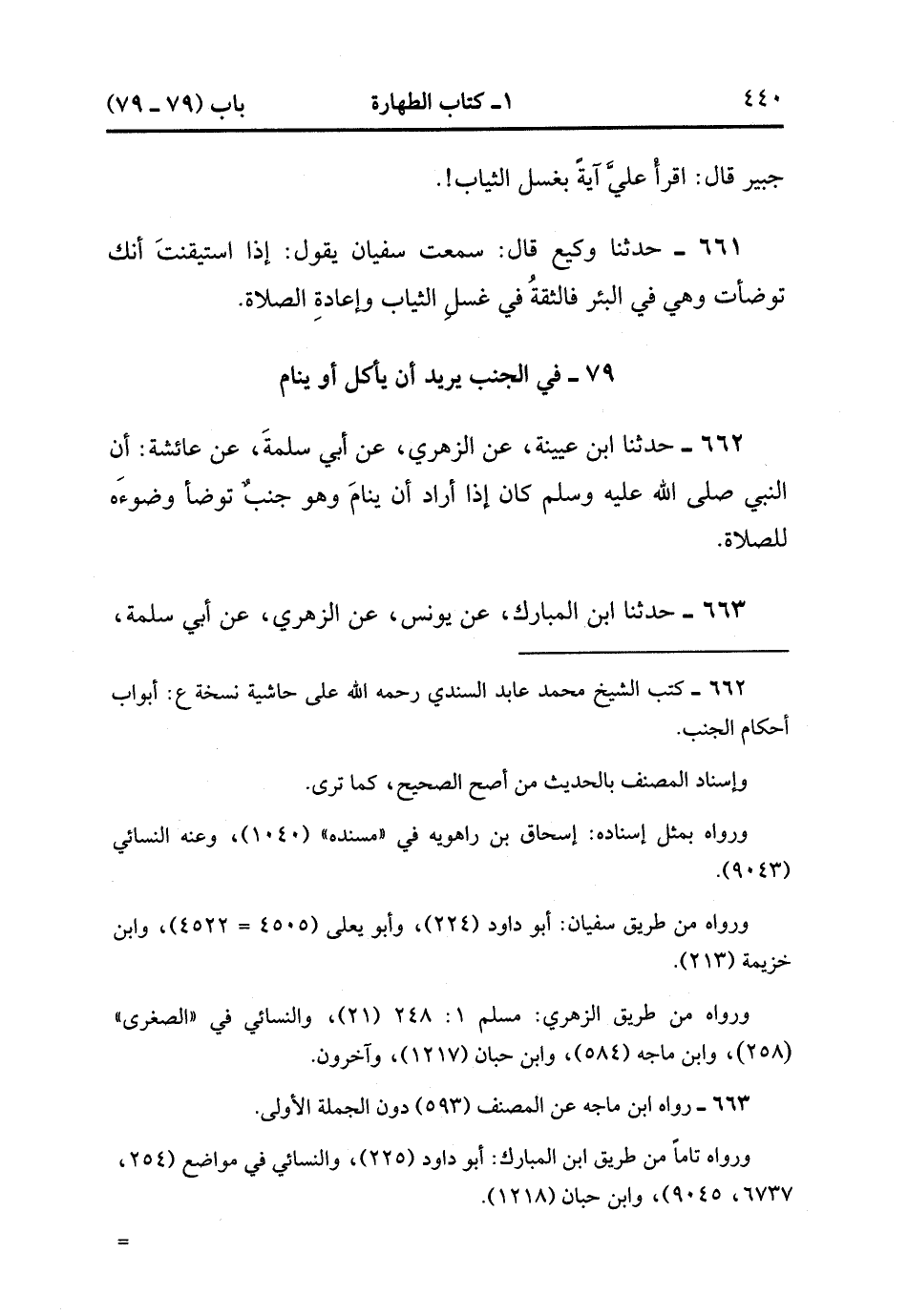 662- حَدَّثَنَا ابْنُ عُيَيْنَةَ ، عَنِ الزُّهْرِيِّ ، عَنْ أَبِي سَلَمَةَ ، عَنْ عَائِشَةَ ، أَنَّ النَّبِيَّ صَلَّى الله عَلَيْهِ وَسَلَّمَ كَانَ إذَا أَرَادَ أَنْ يَنَامَ وَهُوَ جُنُبٌ ، تَوَضَّأَ وُضُوءَهُ لِلصَّلاَةِ. (1/60).