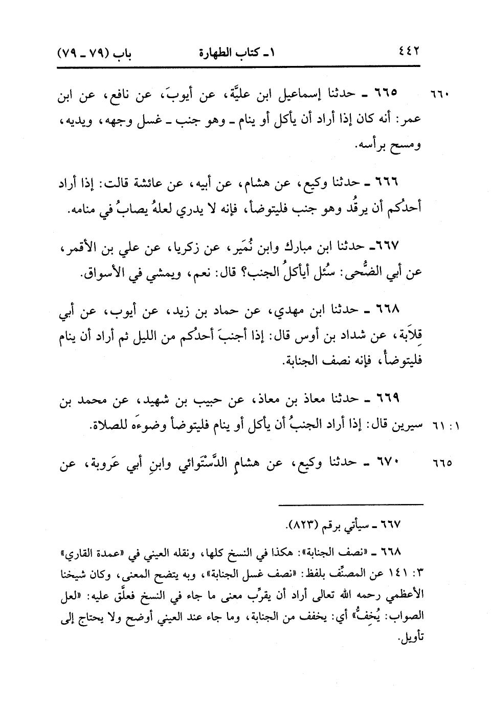 669- حَدَّثَنَا مُعَاذُ بْنُ مُعَاذٍ ، عَنْ حَبِيبِ بْنِ شَهِيد ، عَنْ مُحَمَّدِ بْنِ سِيرِينَ ، قَالَ : إذَا أَرَادَ الْجُنُبُ أَنْ يَأْكُلَ أَوْ يَنَامَ فَلْيَتَوَضَّأْ وُضُوءَهُ لِلصَّلاَةِ. (1/60).
