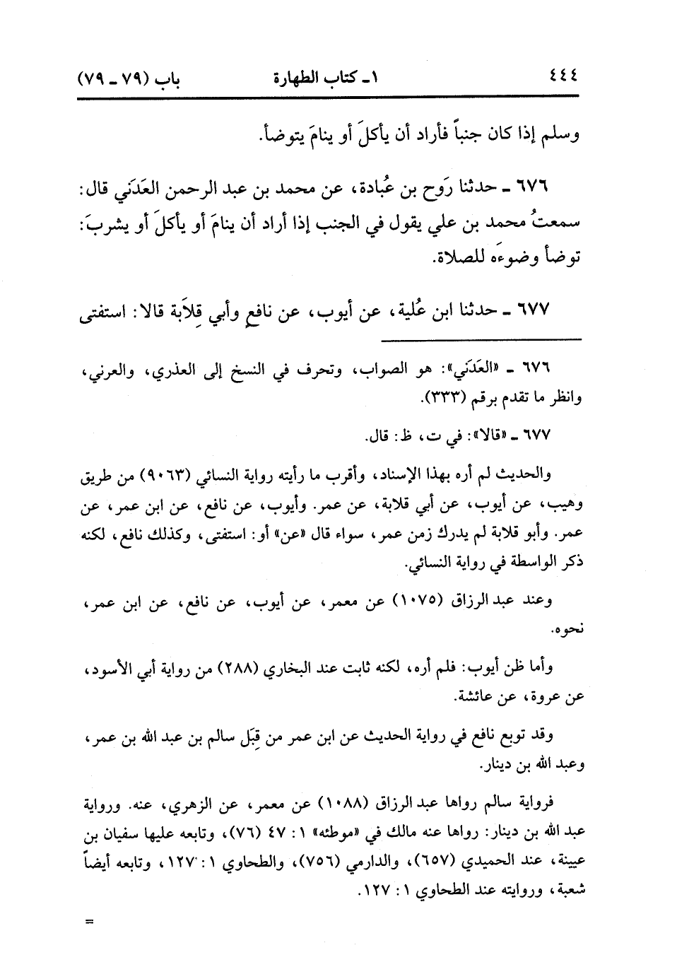 676- حَدَّثَنَا رَوْحُ بْنُ عُبَادَةَ ، عَنْ مُحَمَّدِ بْنِ عَبْدِ الرَّحْمَنِ الْعَدَنِيِّ ، قَالَ : سَمِعْتُ مُحَمَّدَ بْنَ عَلِيٍّ يَقُولُ فِي الْجُنُبِ إذَا أَرَادَ أَنْ يَنَامَ ، أَوْ يَأْكُلَ ، أَوْ يَشْرَبَ : تَوَضَّأَ وُضُوءَهُ لِلصَّلاَةِ.