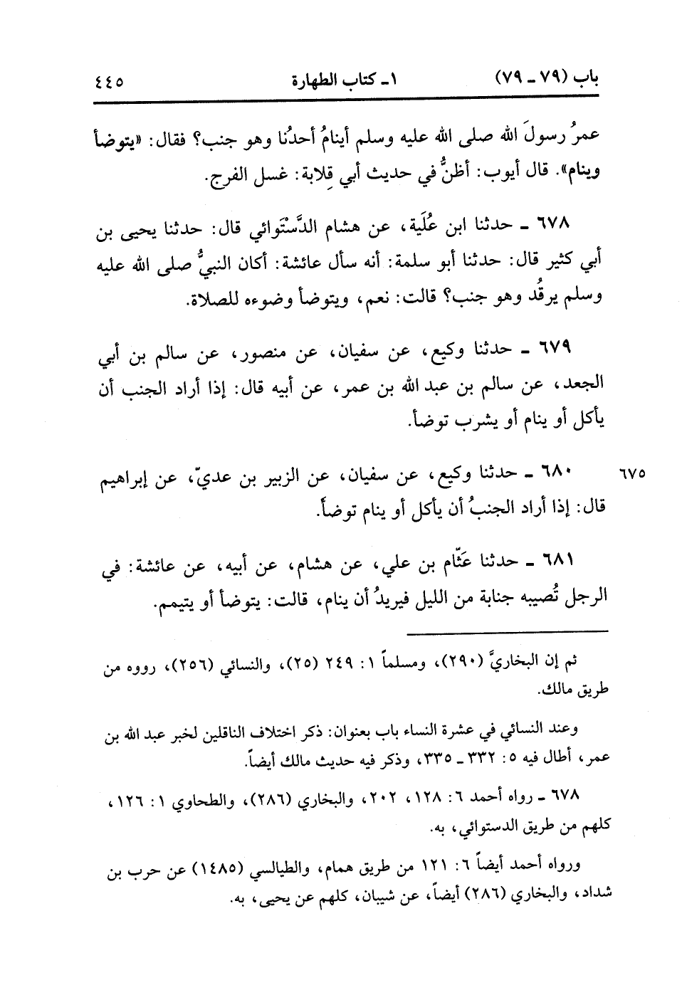 678- حَدَّثَنَا ابْنُ عُلَيَّةَ ، عَنْ هِشَامٍ الدَّسْتُوَائِيِّ , قَالَ : حدَّثَنَا يَحْيَى بْنُ أَبِي كَثِيرٍ ، قَالَ : حَدَّثَنَا أَبُو سَلَمَةَ ؛ أَنَّهُ سَأَلَ عَائِشَةَ : أَكَانَ النَّبِيُّ صَلَّى الله عَلَيْهِ وَسَلَّمَ يَرْقُدُ وَهُوَ جُنُبٌ ؟ قَالَتْ : نَعَمْ ، وَيَتَوَضَّأُ وُضُوءَهُ لِلصَّلاَةِ.