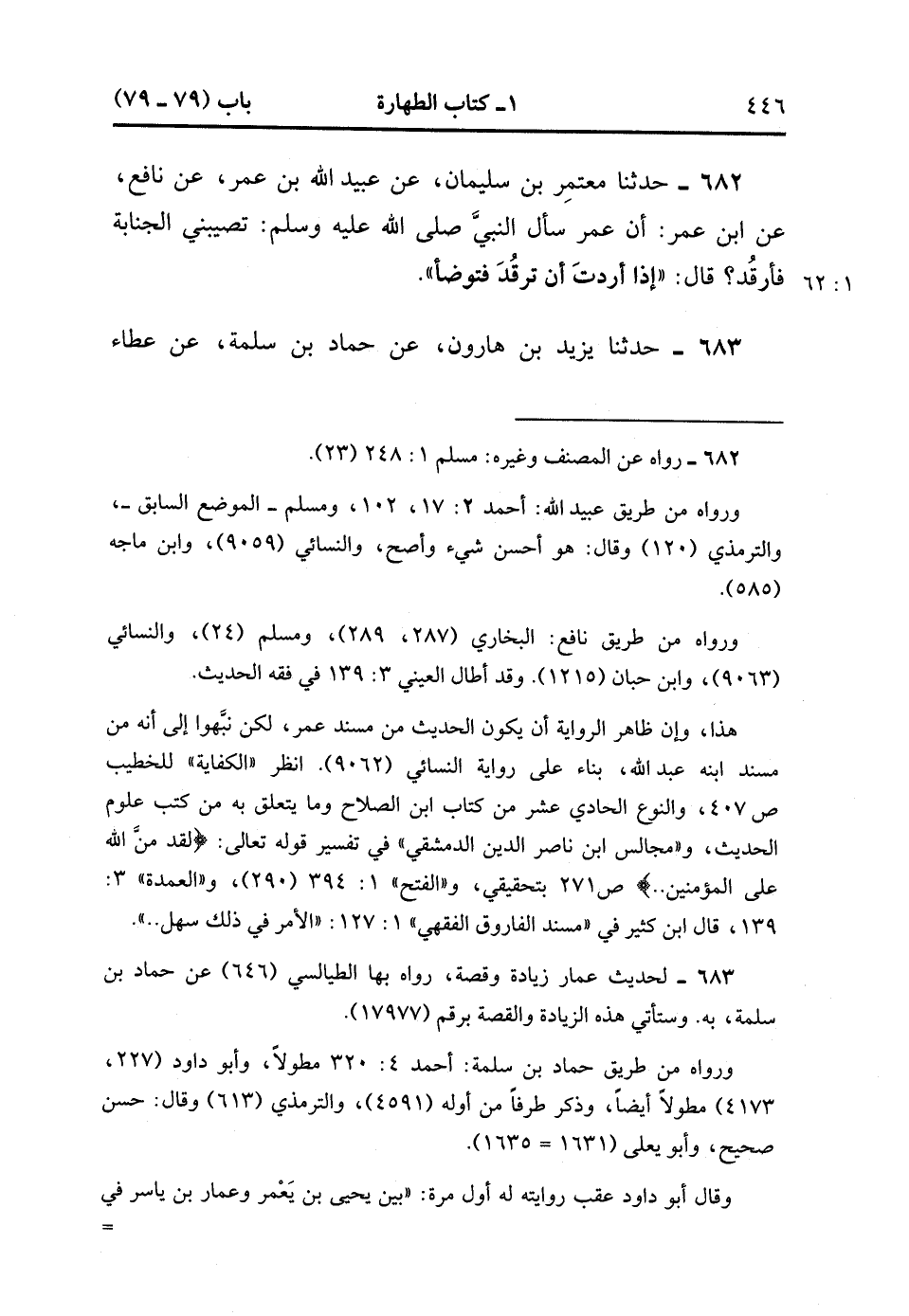682- حَدَّثَنَا مُعْتَمِرُ بْنُ سُلَيْمَانَ ، عَنْ عُبَيْدِ اللهِ بْنِ عُمَرَ ، عَنْ نَافِعٍ ، عَنِ ابْنِ عُمَرَ ، أَنَّ عُمَرَ سَأَلَ النَّبِيَّ صَلَّى الله عَلَيْهِ وَسَلَّمَ : تُصِيبُنِي الْجَنَابَةُ فَأَرْقُدُ ؟ قَالَ : إذَا أَرَدْت أَنْ تَرْقُدَ فَتَوَضَّأَ. (1/61).