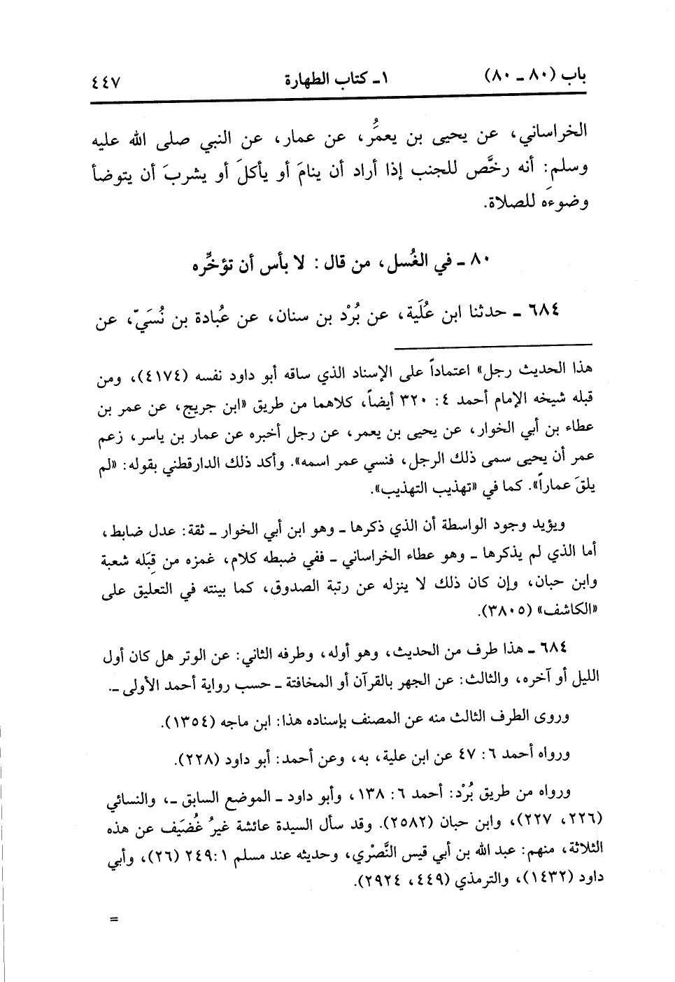 683- حَدَّثَنَا يَزِيدُ بْنُ هَارُونَ ، عَنْ حَمَّادِ بْنِ سَلَمَةَ ، عَنْ عَطَاءٍ الْخُرَاسَانِيِّ ، عَنْ يَحْيَى بْنِ يَعْمَُرَ ، عَنْ عَمَّارٍ ، عَنِ النَّبِيِّ صَلَّى الله عَلَيْهِ وَسَلَّمَ ؛ أَنَّهُ رَخَّصَ لِلْجُنُبِ إذَا أَرَادَ أَنْ يَنَامَ ، أَوْ يَأْكُلَ ، أَوْ يَشْرَبَ ، أَنْ يَتَوَضَّأَ وُضُوءَهُ لِلصَّلاَةِ. (1/62).
