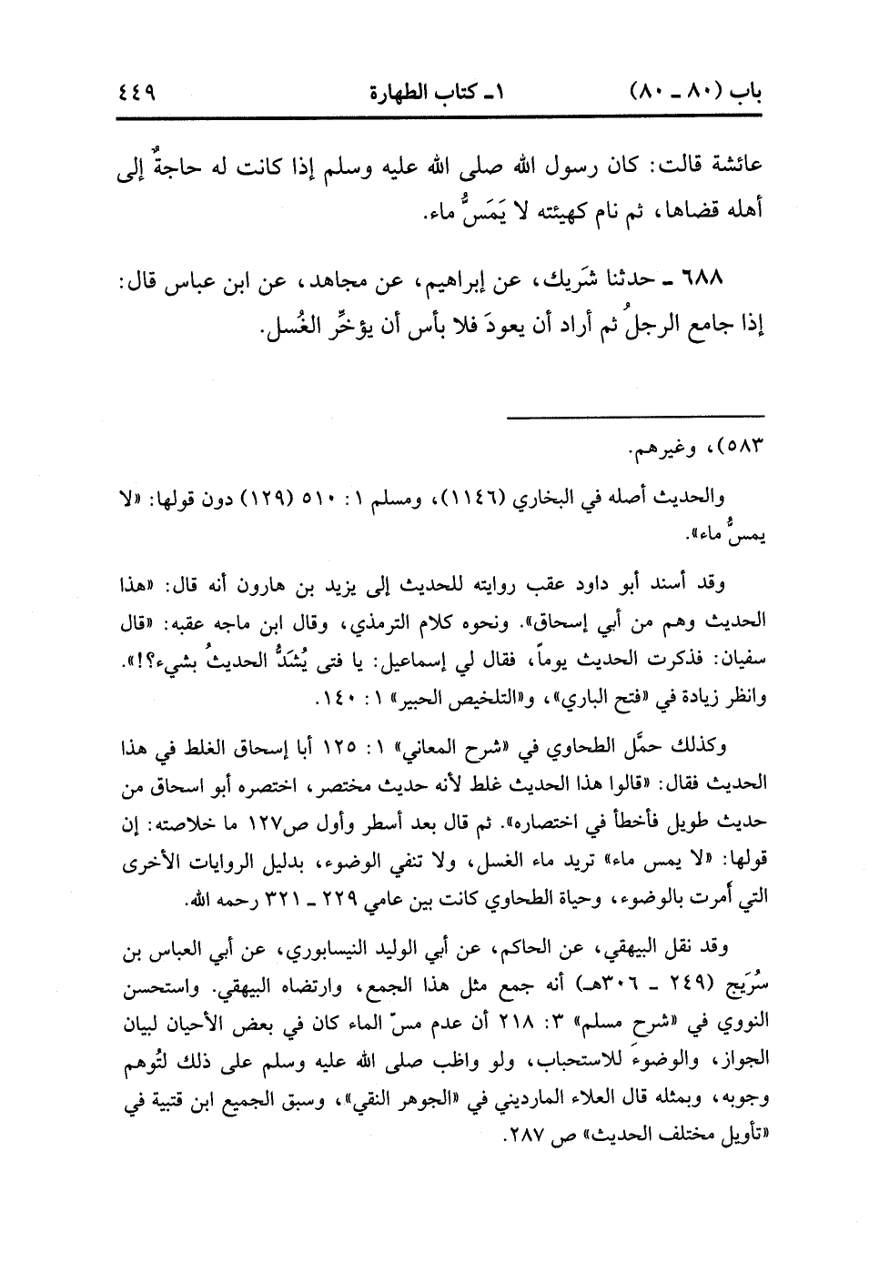 687- حَدَّثَنَا أَبُو الأَحْوَصِِ ، عَنْ أَبِي إِسْحَاقَ ، عَنِ الأَسْوَدِ ، عَنْ عَائِشَةَ ، قَالَتْ : كَانَ رَسُولُ اللهِ صَلَّى الله عَلَيْهِ وَسَلَّمَ إذَا كَانَتْ لَهُ حَاجَةٌ إلَى أَهْلِهِ قَضَاهَا ، ثُمَّ نَامَ كَهَيْئَتِهِ لا يَمَسُّ مَاءً.