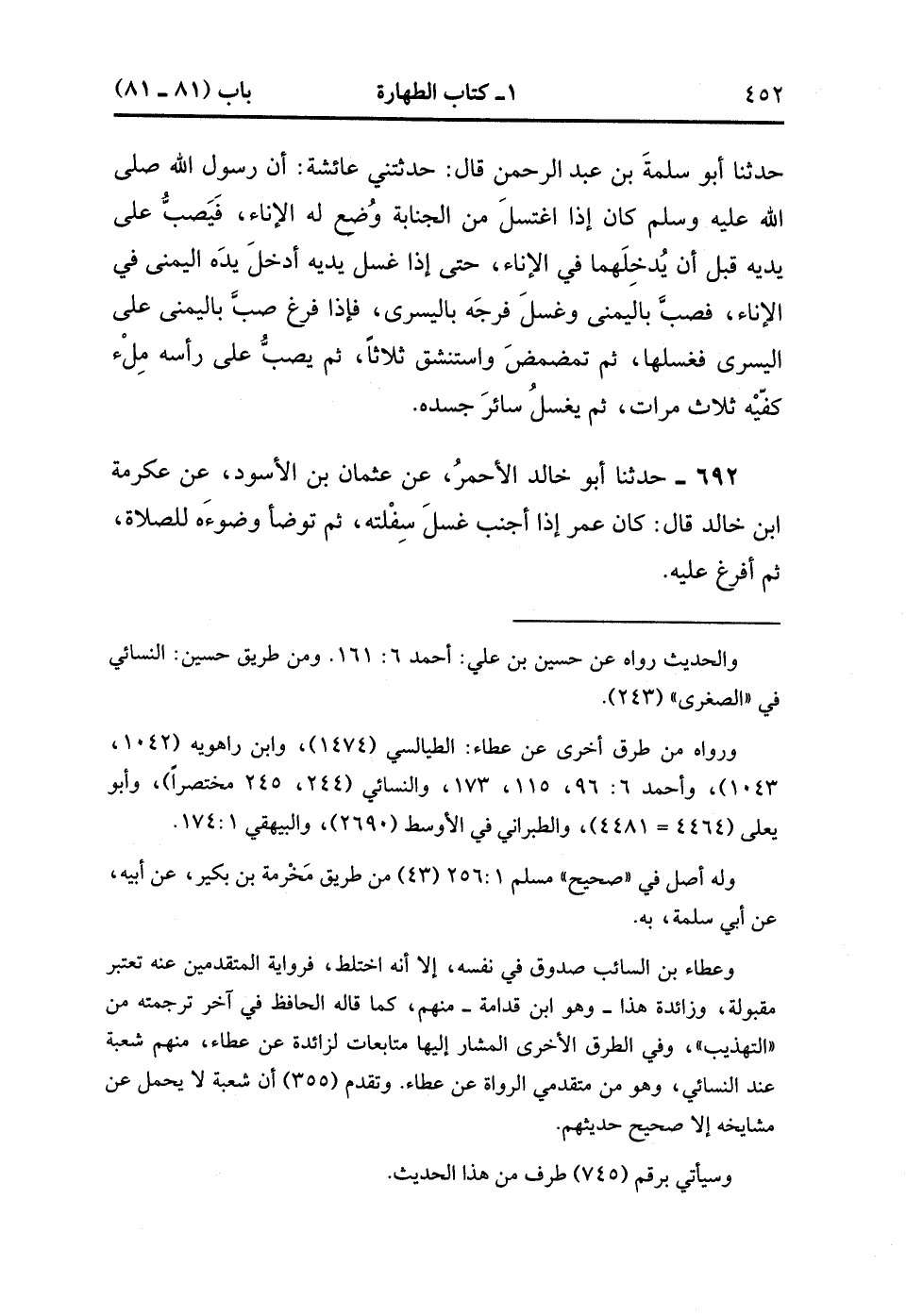 692- حَدَّثَنَا أَبُو خَالِدٍ الأَحْمَرِِِ ، عَنْ عُثْمَانَ بْنِ الأَسْوَدِ ، عَنْ عِكْرِمَةَ بْنِ خَالِدٍ ، قَالَ : كَانَ عُمَرُ إذَا أَجْنَبَ غَسَلَ سِفْلَتَهُ ، ثُمَّ تَوَضَّأَ وُضُوءَهُ لِلصَّلاَةِ ، ثُمَّ أَفْرَغَ عَلَيْهِ. (1/63).