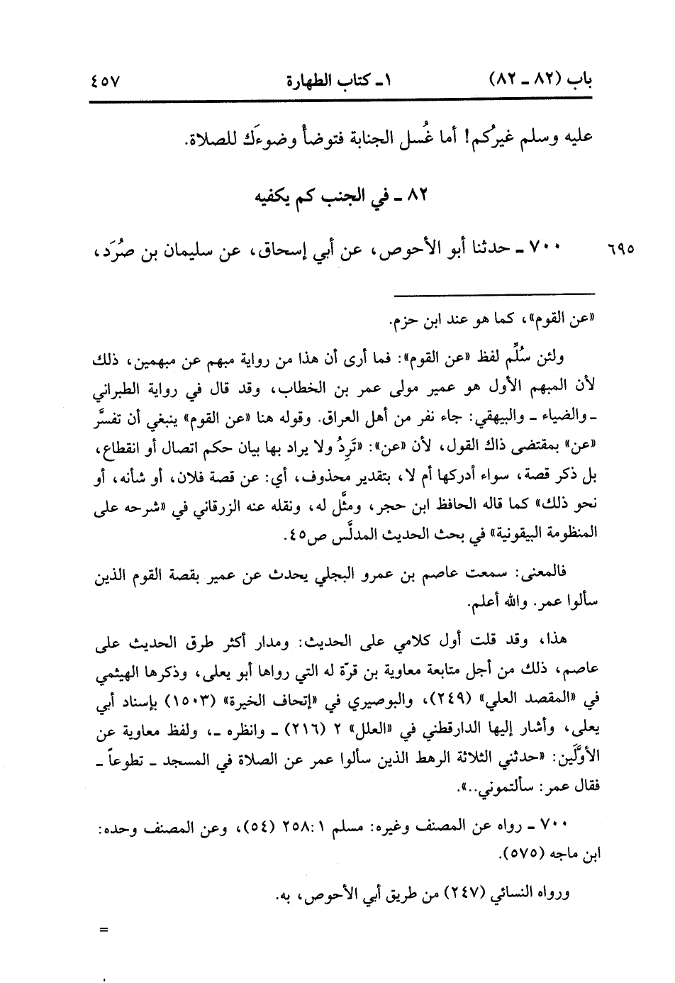 700- حَدَّثَنَا أَبُو الأَحْوَصِِ ، عَنْ أَبِي إِسْحَاقَ ، عَنْ سُلَيْمَانَ بْنِ صُرَدٍ ، عَنْ جُبَيْرِ بْنِ مُطْعِمٍ ، قَالَ : تَمَارَوْا فِي الْغُسْلِ عِنْدَ رَسُولِ اللهِ صَلَّى الله عَلَيْهِ وَسَلَّمَ ، فَقَالَ بَعْضُ الْقَوْمِ : أَمَّا أَنَا فَأَغْسِلُ رَأْسِي كَذَا وَكَذَا ، فَقَالَ النَّبِيُّ صَلَّى الله عَلَيْهِ وَسَلَّمَ : أَمَّا أَنَا فَأُفِيضُ عَلَى رَأْسِي ثَلاَثَةَ أَكُفٍّ. (1/64).