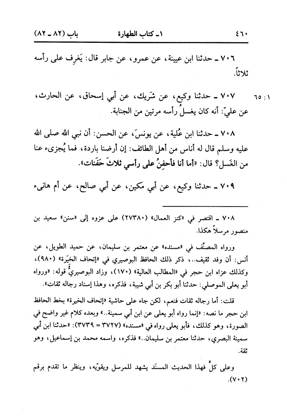 707- حَدَّثَنَا وَكِيعٌ ، عَنْ شَرِيكٍ ، عَنْ أَبِي إِسْحَاقَ ، عَنِ الْحَارِثِ ، عَنْ عَلِيٍّ ؛ أَنَّهُ كَانَ يَغْسِلُ رَأْسَهُ مَرَّتَيْنِ مِنَ الْجَنَابَةِ. (1/64).