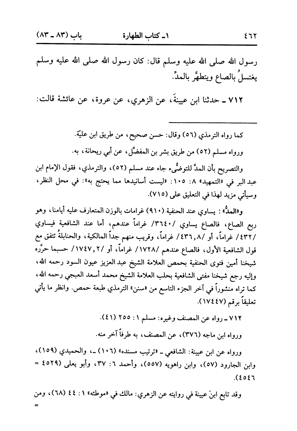 711- حَدَّثَنَا إسْمَاعِيلُ ابْنُ عُلَيَّةَ ، عَنْ أَبِي رَيْحَانَةَ ، عَنْ سَفِينَةَ صَاحِبِ رَسُولِ اللهِ صَلَّى الله عَلَيْهِ وَسَلَّمَ ، قَالَ : كَانَ رَسُولُ اللهِ صَلَّى الله عَلَيْهِ وَسَلَّمَ يَغْتَسِلُ بِالصَّاعِ ، وَيَتَطَهَّرُ بِالْمُدِّ. (1/65).