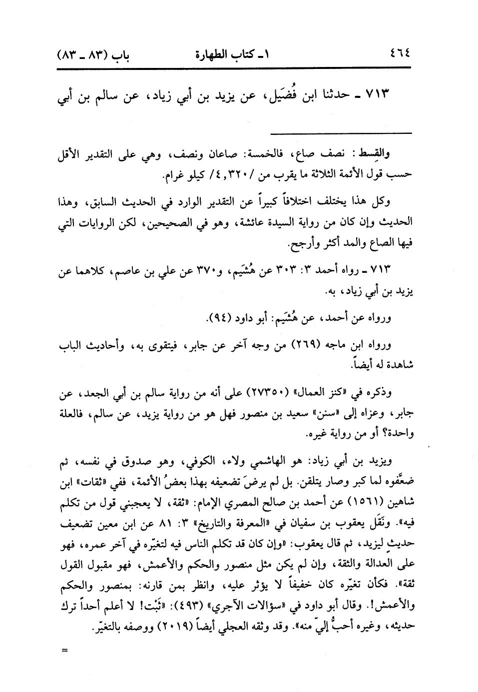 713- حَدَّثَنَا ابْنُ فُضَيْلٍ ، عَنْ يَزِيدَ بْنِ أَبِي زِيَادٍ ، عَنْ سَالِمِ بْنِ أَبِي الْجَعْدِ ، عَنْ جَابِرٍ ، عَنِ النَّبِيِّ صَلَّى الله عَلَيْهِ وَسَلَّمَ ، قَالَ : يُجْزِىءُ مِنَ الْوُضُوءِ الْمُدُّ ، وَمِنَ الْجَنَابَةِ الصَّاعُ ، فَقَالَ رَجُلٌ : مَا يَكْفِينَا يَا جَابِرُ ، فَقَالَ : قَدْ كَفَى مَنْ هُوَ خَيْرٌ مِنْك وَأَكْثَرُ شَعْرًا. (1/65).
