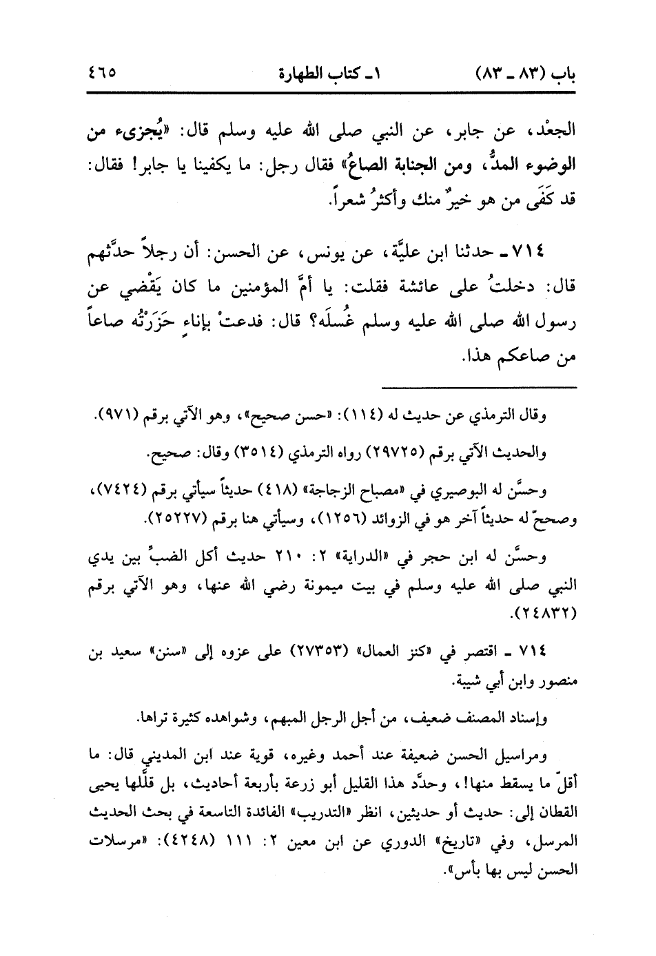 714- حَدَّثَنَا ابْنُ عُلَيَّةَ ، عَنْ يُونُسَ ، عَنِ الْحَسَنِ ؛ أَنَّ رَجُلاً حَدَّثَهُمْ ، قَالَ : دَخَلْتُ عَلَى عَائِشَةَ ، فَقُلْتُ : يَا أُمَّ الْمُؤْمِنِينَ ، مَا كَانَ يَقْضِي عَنْ رَسُولِ اللهِ صَلَّى الله عَلَيْهِ وَسَلَّمَ غُسْلَهُ ؟ قَالَ : فَدَعَتْ بِإِنَاءٍ حَزَرَتْهُ صَاعًا مِنْ صَاعِكُمْ هَذَا. (1/65).