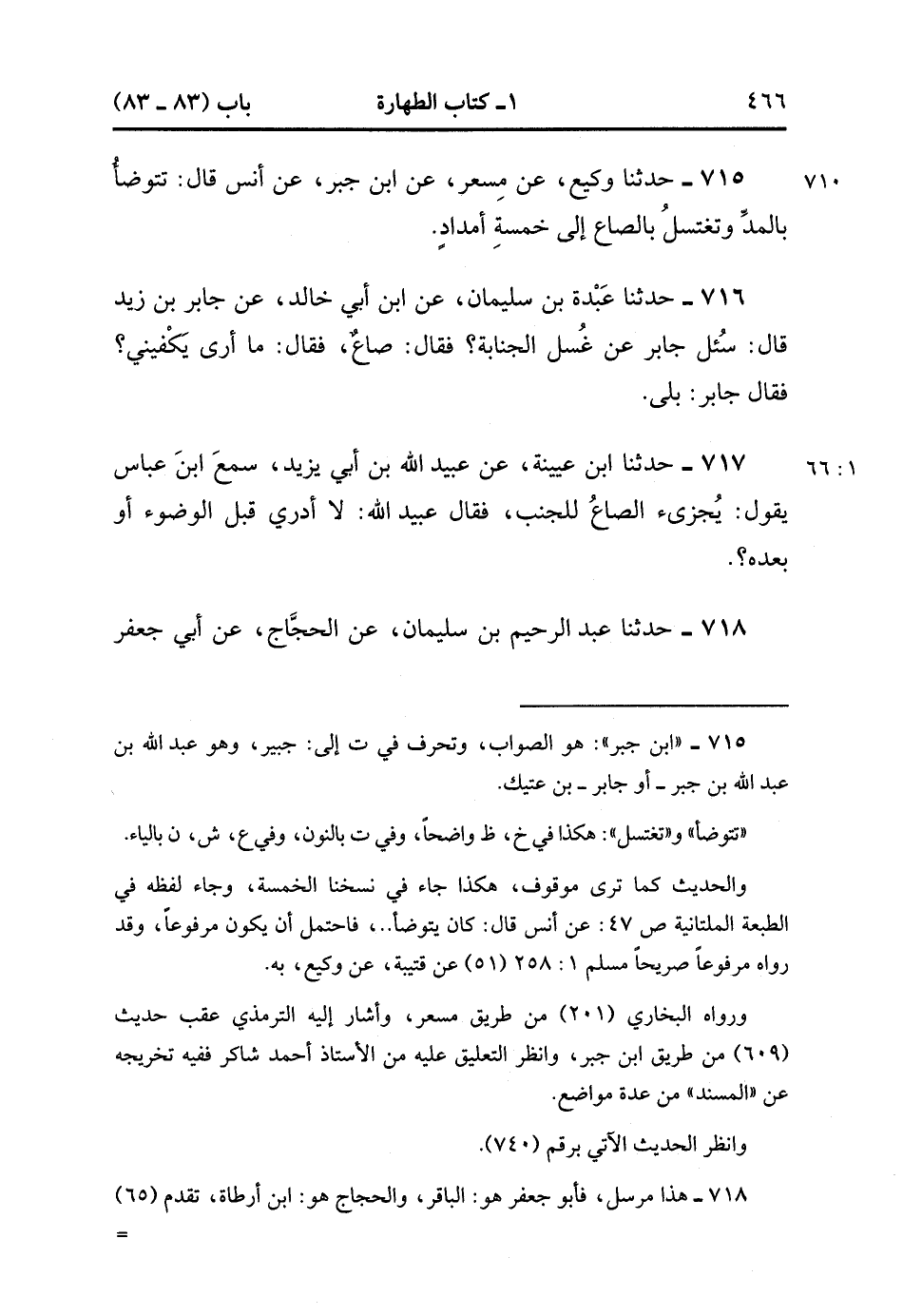 715- حَدَّثَنَا وَكِيعٌ ، عَنْ مِسْعَرٍ ، عَنِ ابْنِ جَبْرٍ ، عَنْ أَنَسٍ ، قَالَ : تَتَوَضَّأُ بِالْمُدِّ ، وتَغْتَسِلُ بِالصَّاعِ إِلَى خَمْسَةِ أَمْدَادٍ.