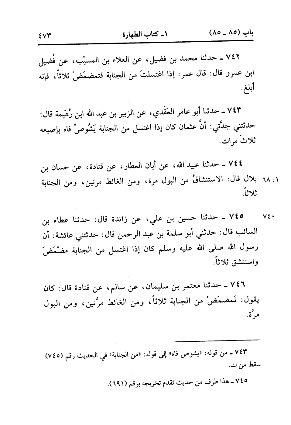 746- حَدَّثَنَا مُعْتَمِرُ بْنُ سُلَيْمَانَ ، عَنْ سَالِمٍ ، عَنْ قَتَادَةَ ، قَالَ : كَانَ يَقُولُ : تَمَضْمَضْ مِنَ الْجَنَابَةِ ثَلاَثًا ، وَمِنَ الْغَائِطِ مَرَّتَيْنِ ، وَمِنَ الْبَوْلِ مَرَّةً. (1/68).