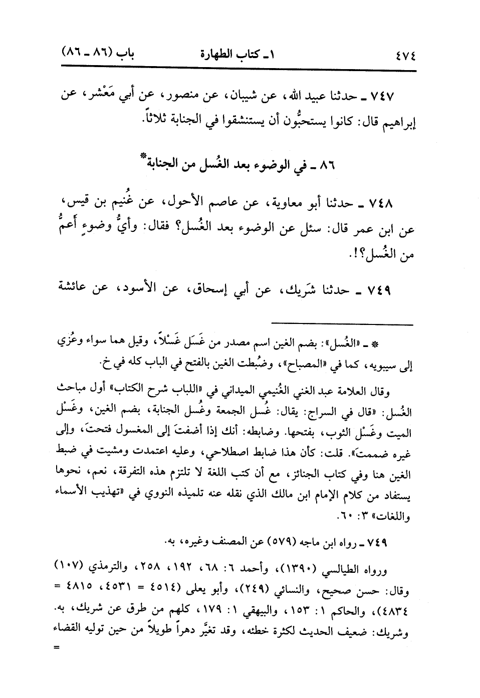 749- حَدَّثَنَا شَرِيكٌ ، عَنْ أَبِي إِسْحَاقَ ، عَنِ الأَسْوَدِ ، عَنْ عَائِشَةَ ، قَالَتْ : كَانَ رَسُولُ اللهِ صَلَّى الله عَلَيْهِ وَسَلَّمَ لا يَتَوَضَّأُ بَعْدَ الْغُسْلِ مِنَ الْجَنَابَةِ. (1/68).