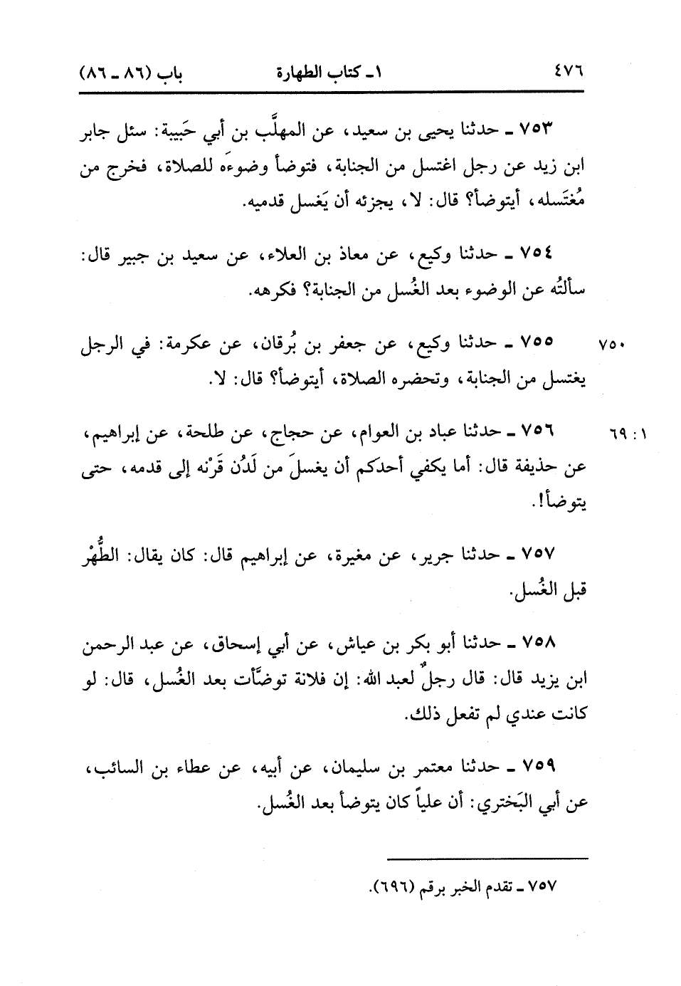 757- حَدَّثَنَا جَرِيرٌ ، عَنْ مُغِيرَةَ ، عَنْ إبْرَاهِيمَ ، قَالَ : كَانَ يُقَالُ : الطُّهر قَبْلَ الْغُسْلِ.