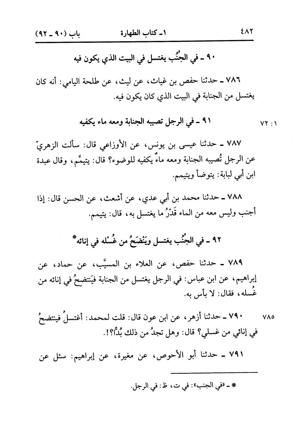 783- حَدَّثَنَا ابْنُ مَهْدِيٍّ ، عَنْ سُفْيَانَ ، عَنْ مَنْصُورِ ابْنِ صَفِيَّةَ ، عَنْ سَعِيدِ بْنِ جُبَيْرٍ ؛ فِي الْجُنُبِ يَغْسِلُ رَأْسَهُ بِالسِّدْرِ ، قَالَ : لا يَغْسِلُ رَأْسَهُ.