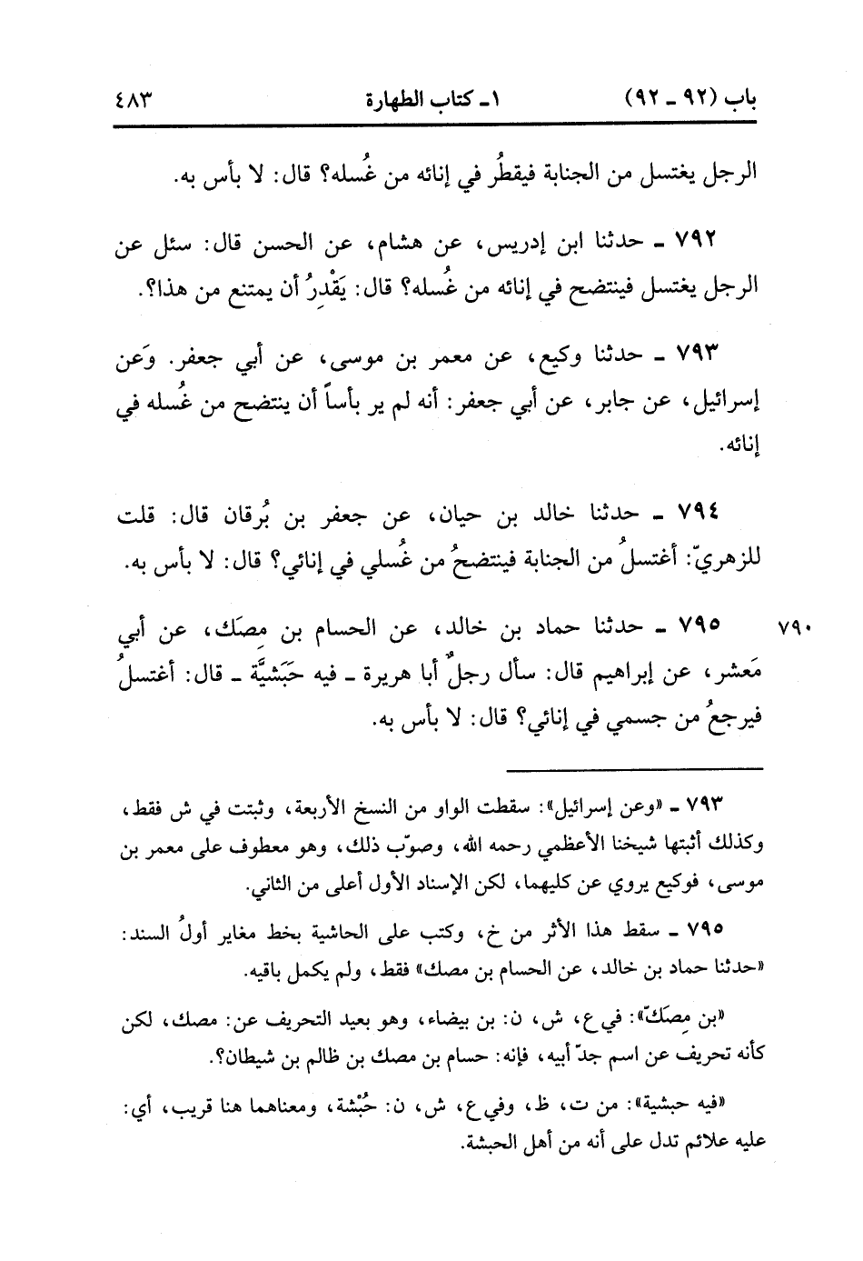 795- حَدَّثَنَا حَمَّادُ بْنُ خَالِدٍ ، عَنِ الْحُسَامِ بْنِ مِصَك ، عَنْ أَبِي مَعْشَرٍ ، عَنْ إبْرَاهِيمَ ، قَالَ : سَأَلَ رَجُلٌ أَبَا هُرَيْرَةَ - فِيهِ حَبَشِيِّة - قَالَ : أَغْتَسِلُ فَيَرْجِعُ مِنْ جِسْمِي فِي إنَائِي ؟ قَالَ : لا بَأْسَ بِهِ. (1/72).