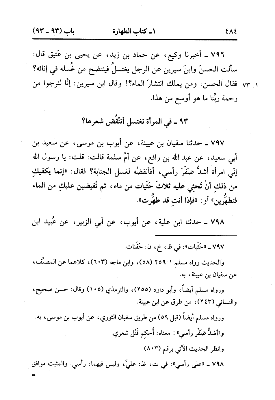797- حَدَّثَنَا سُفْيَانُ بْنُ عُيَيْنَةَ ، عَنْ أَيُّوبَ بْنِ مُوسَى ، عَنْ سَعِيدِ بْنِ أَبِي سَعِيدٍ ، عَنْ عَبْدِ اللهِ بْنِ رَافِعٍ ، عَنْ أُمِّ سَلَمَةَ ، قَالَتْ : قُلْتُ : يَا رَسُولَ اللهِ ، إنِّي امْرَأَةٌ أَشُدُّ ضَفْرَ رَأْسِي ، أَفَأَنْقُضُهُ لِغُسْلِ الْجَنَابَةِ ؟ فَقَالَ : إنَّمَا يَكْفِيكِ مِنْ ذَلِكَ أَنْ تَحْثِي عَلَيْهِ ثَلاَثَ حَثَيَاتٍ مِنْ مَاءٍ ، ثُمَّ تُفِيضِينَ عَلَيْكِ مِنَ الْمَاءِ فَتَطْهَُرِينَ أَوْ فَإِذا أَنْتِ قَدْ طَهَُرْتِ. (1/73).