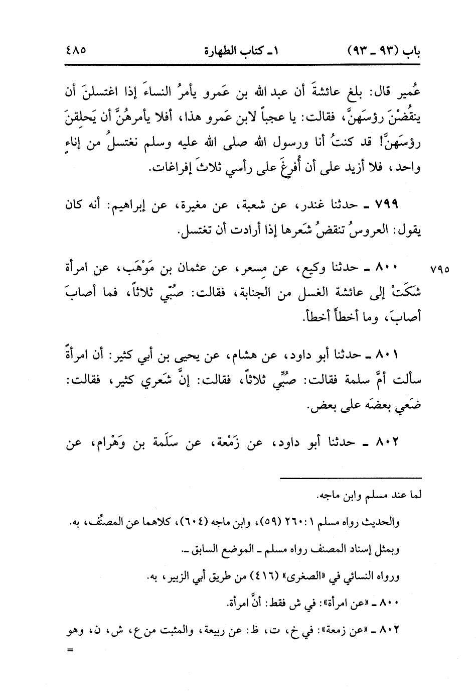 798- حَدَّثَنَا ابْنُ عُلَيَّةَ ، عَنْ أَيُّوبَ ، عَنْ أَبِي الزُّبَيْرِ ، عَنْ عُبَيْدِ بْنِ عُمَيْرٍ ، قَالَ : بَلَغَ عَائِشَةَ أَنَّ عَبْدَ اللهِ بْنَ عَمْرٍو يَأْمُرُ النِّسَاءَ إذَا اغْتَسَلْنَ ، أَنْ يَنْقُضْنَ رُؤُوسَهُنَّ ، فَقَالَتْ : يَا عَجَبًا لابْنِ عَمْرٍو هَذَا ، أَفَلاَ يَأْمُرُهُنَّ أَنْ يَحْلِقْنَ رُؤُوسَهُنَّ ! قَدْ كُنْتُ أَنَا وَرَسُولُ اللهِ صَلَّى الله عَلَيْهِ وَسَلَّمَ نَغْتَسِلُ مِنْ إنَاءٍ وَاحِدٍ ، فَلاَ أَزِيدُ عَلَى أَنْ أُفْرِغَ عَلَى رَأْسِي ثَلاَثَ إفْرَاغَاتٍ.