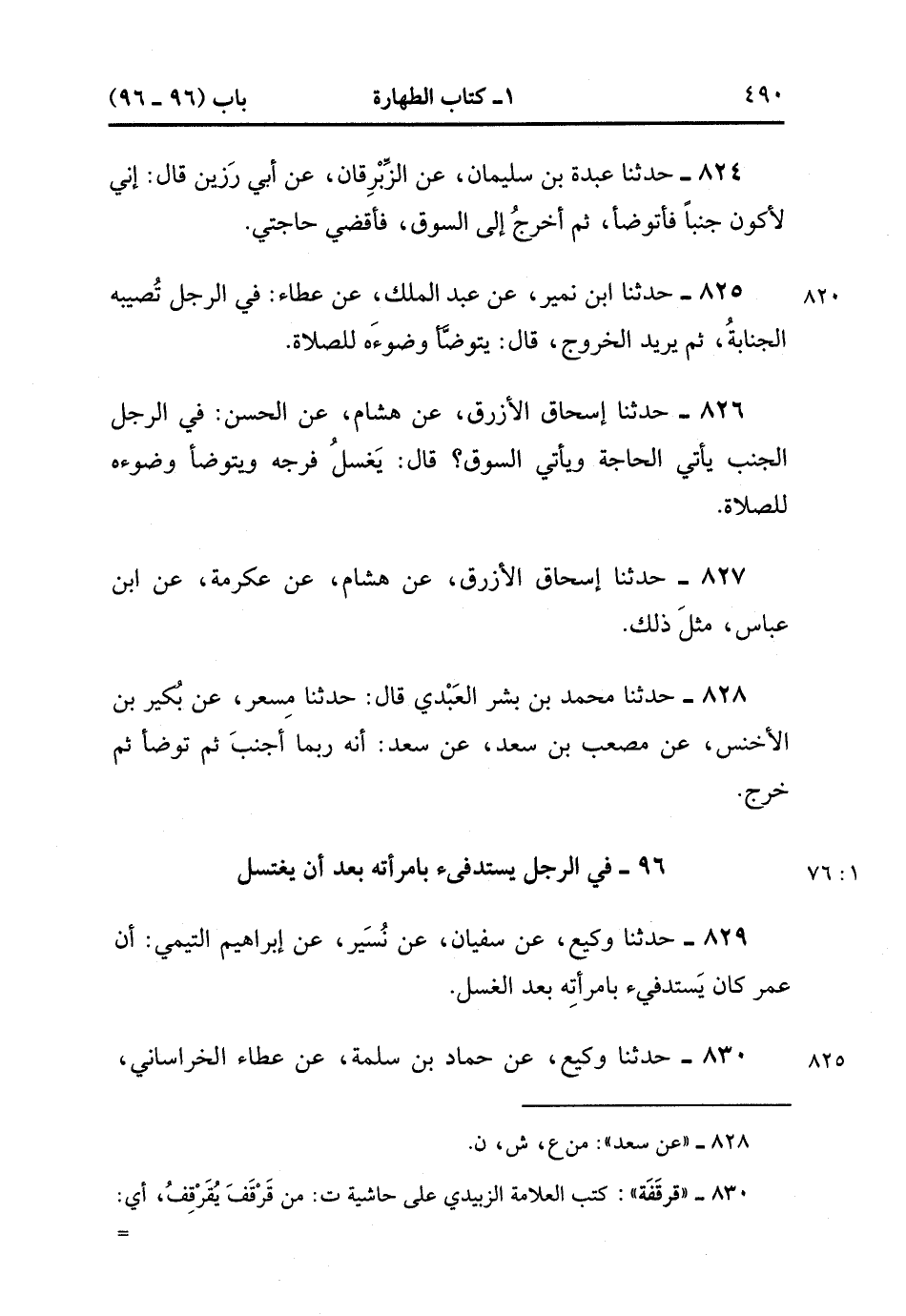 828- حَدَّثَنَا مُحَمَّدُ بْنُ بِشْرٍ الْعَبْدِيُّ , قَالَ : حدَّثَنَا مِسْعَرٌ ، عَنْ بُكَيْرِ بْنِ الأَخْنَسِ ، عَنْ مُصْعَبِ بْنِ سَعْدٍ ، عَنْ سَعْدٍ ؛ أَنَّهُ رُبَّمَا أَجْنَبَ ثُمَّ تَوَضَّأَ ثُمَّ خَرَجَ. (1/75)