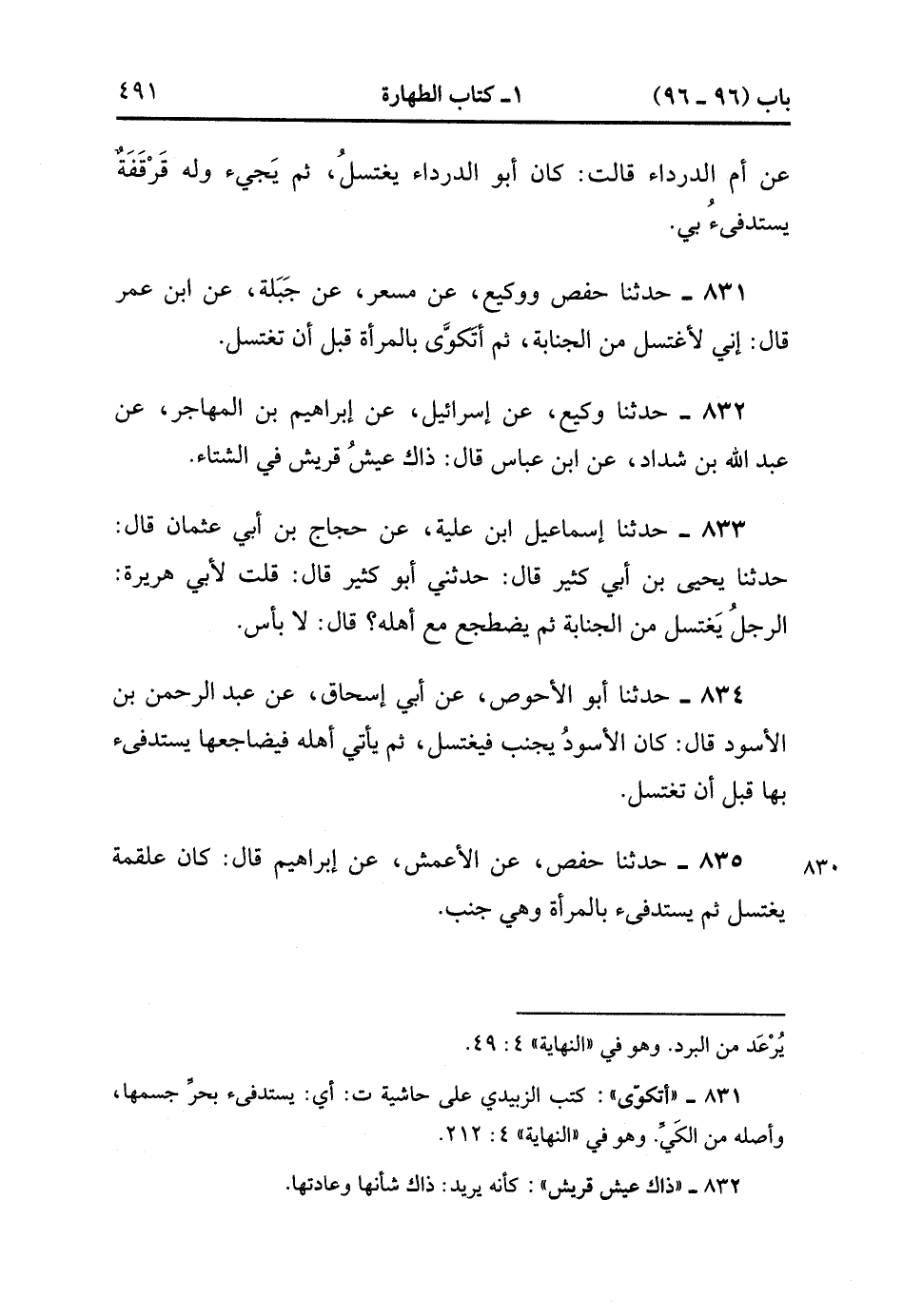 835- حَدَّثَنَا حَفْصٌ ، عَنِ الأَعْمَشِ ، عَنْ إبْرَاهِيمَ ، قَالَ : كَانَ عَلْقَمَةُ يَغْتَسِلُ ، ثُمَّ يَسْتَدْفِىءُ بِالْمَرْأَةِ وَهِيَ جُنُبٌ. (1/76).