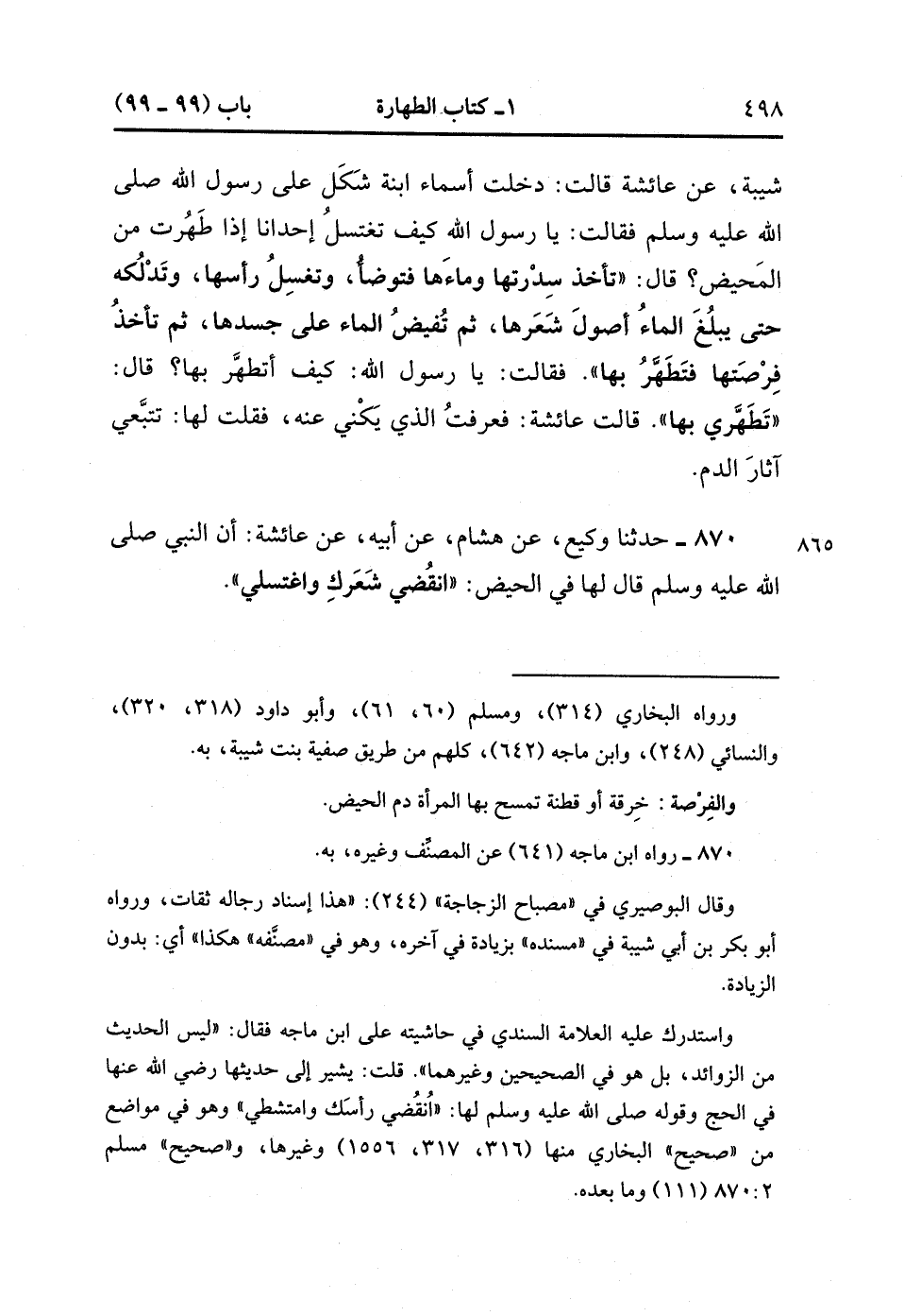 869- حَدَّثَنَا أَبُو الأَحْوَصِِ ، عَنْ إبْرَاهِيمَ بْنِ مُهَاجِرٍ ، عَنْ صَفِيَّةَ ابْنَةِ شَيْبَةَ ، عَنْ عَائِشَةَ قَالَتْ : دَخَلَتْ أَسْمَاءُ ابْنَةُ شَكَلٍ عَلَى رَسُولِ اللهِ صَلَّى الله عَلَيْهِ وَسَلَّمَ فَقَالَتْ : يَا رَسُولَ اللهِ كَيْفَ تَغْتَسِلُ إحْدَانَا إذَا طَهُرَتْ مِنَ الْمَحِيضِ ؟ قَالَ : تَأْخُذُ سِدْرَتَهَا وَمَاءَها فَتَوَضَّأُ ، وَتَغْسِلُ رَأْسَهَا ، وَتَدْلُكُهُ حَتَّى يَبْلُغَ الْمَاءُ أُصُولَ شَعَرِهَا ، ثُمَّ تُفِيضُ الْمَاءَ عَلَى جَسَدِهَا ، ثُمَّ تَأْخُذُ فِرْصَتَهَا فَتَطَهَّرُ بِهَا ، فَقَالَتْ : يَا رَسُولَ اللهِ ، كَيْفَ أَتَطَهَّرُ بِهَا ؟ قَالَ : تَطَهَّرِي بِهَا ، قَالَتْ عَائِشَةُ : فَعَرَفْتُ الَّذِي يَكْني عَنْهُ ، فَقُلْتُ لَهَا : تَتَبَّعِي آثَارَ الدَّمِ.