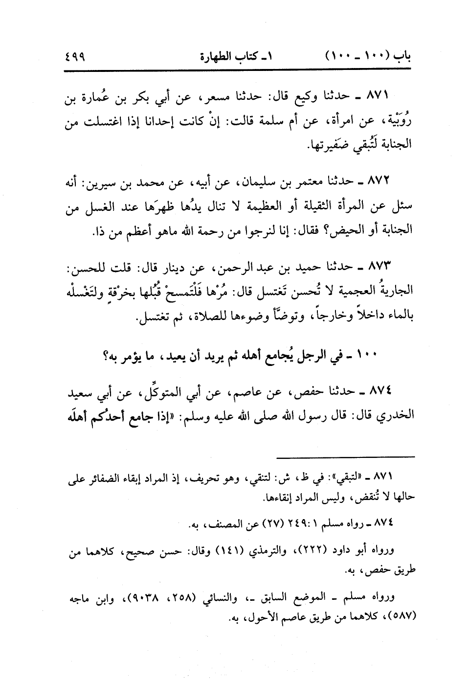 874- حَدَّثَنَا حَفْصٌ ، عَنْ عَاصِمٍ ، عَنْ أَبِي الْمُتَوَكِّلِ ، عَنْ أَبِي سَعِيدٍ الْخُدْرِيِّ قَالَ : قَالَ رَسُولُ اللهِ صَلَّى الله عَلَيْهِ وَسَلَّمَ : إذَا جَامَعَ أَحَدُكُمْ أَهْلَهُ مِنَ اللَّيْلِ ، ثُمَّ أَرَادَ أَنْ يَعُودَ فَلْيَتَوَضَّأْ بَيْنَهُمَا وُضُوءًا. (1/79).