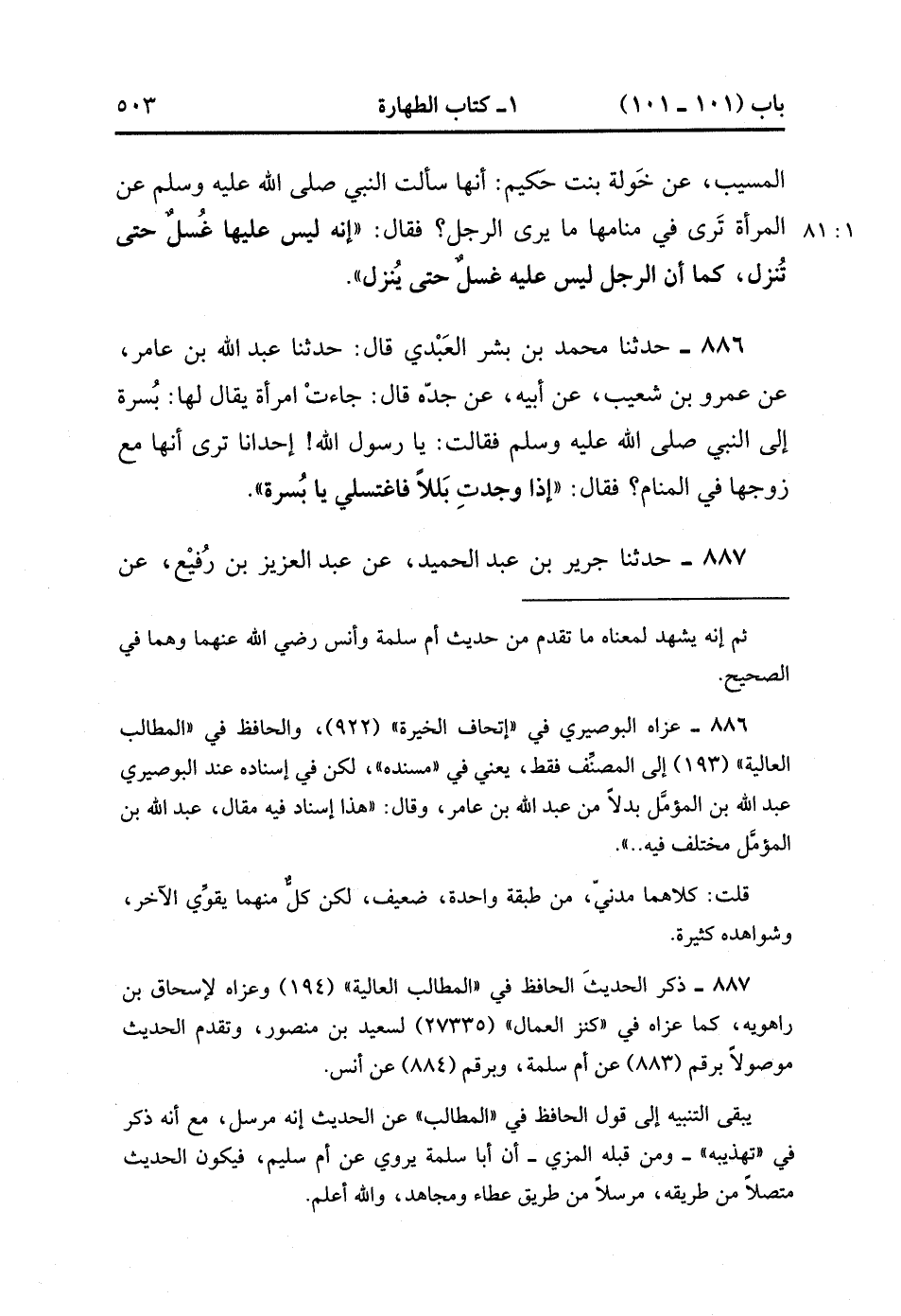 887- حَدَّثَنَا جَرِيرُ بْنُ عَبْدِ الْحَمِيدِ ، عَنْ عَبْدِ الْعَزِيزِ بْنِ رُفَيْعٍ ، عَنْ عَطَاءٍ وَأَبِي سَلَمَةَ بْنِ عَبْدِ الرَّحْمَنِ ، وَمُجَاهِدٍ قَالُوا : إنَّ أُمَّ سُلَيْمٍ ، قَالَتْ : يَا رَسُولَ اللهِ ! الْمَرْأَةُ تَرَى فِي مَنَامِهَا مَا يَرَى الرَّجُلُ ، أَيَجِبُ عَلَيْهَا الْغُسْلُ ؟ قَالَ : هَلْ تَجِدُ شَهْوَةً ؟ قَالَتْ : لَعَلَّهُ ! قَالَ : هَلْ تَجِدُ بَلَلاً ؟ قَالَتْ : لَعَلَّهُ ! قَالَ : فَلْتَغْتَسِلْ فَلَقِيَتْهَا نِسْوَةٌ فَقُلْنَ لَهَا : فَضَحْتينَا عِنْدَ رَسُولِ اللهِ صَلَّى الله عَلَيْهِ وَسَلَّمَ ، فَقَالَتْ : وَاللَّهِ مَا كُنْتُ لأَنْتَهِيَ حَتَّى أَعْلَمَ فِي حِلٍّ أَنَا أَوْ فِي حَرَامٍ. (1/81).