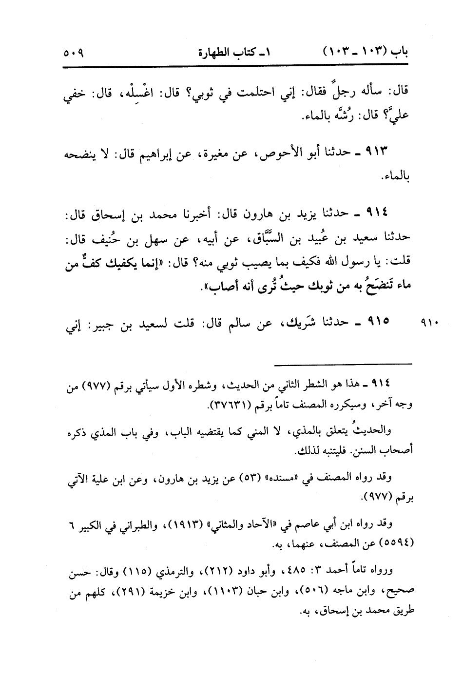 914- حَدَّثَنَا يَزِيدُ بْنُ هَارُونَ ، قَالَ : أَخبرنَا مُحَمَّدُ بْنُ إِسْحَاقَ ، قَالَ : حَدَّثَنَا سَعِيدُ بْنُ عُبَيْدِ بْنِ السَّبَّاقِ ، عَنْ أَبِيهِ ، عَنْ سَهْلِ بْنِ حُنَيْفٍ ، قَالَ : قُلْتُ : يَا رَسُولَ اللهِ فَكَيْفَ بِمَا يُصِيبُ ثَوْبِي مِنْهُ ؟ قَالَ : إنَّمَا يَكْفِيك كَفٌّ مِنْ مَاءٍ تَنْضَحُ بِهِ مِنْ ثَوْبِكَ حَيْثُ تُرَى أَنَّهُ أَصَابَ. (1/83).