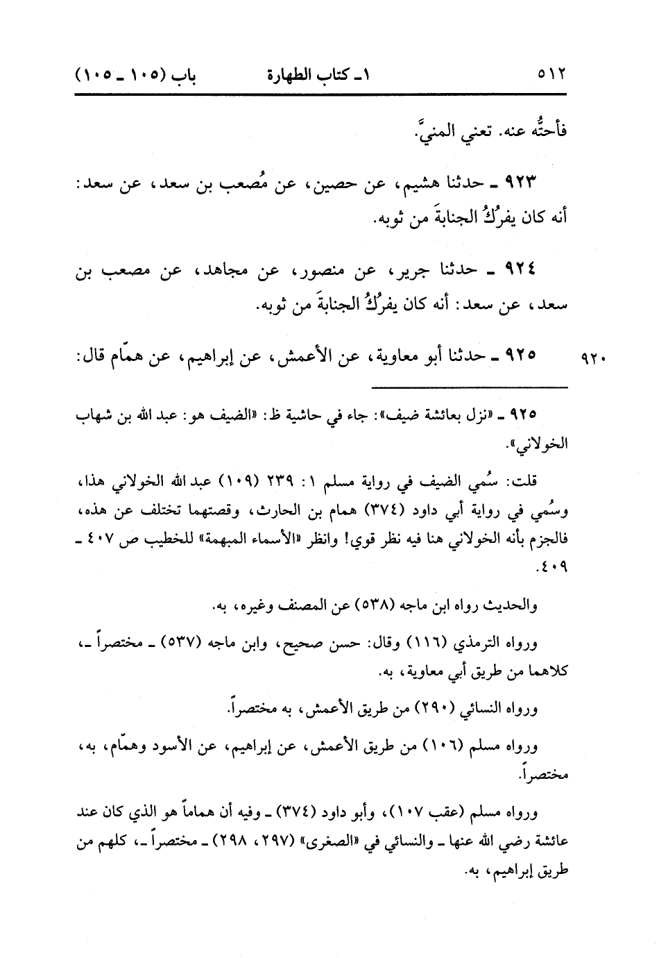 924- حَدَّثَنَا جَرِيرٌ ، عَنْ مَنْصُورٍ ، عَنْ مُجَاهِدٍ ، عَنْ مُصْعَبِ بْنِ سَعْدٍ ، عَنْ سَعْدٍ ؛ أَنَّهُ كَانَ يَفْرُكُ الْجَنَابَةَ مِنْ ثَوْبِهِ. (1/84).