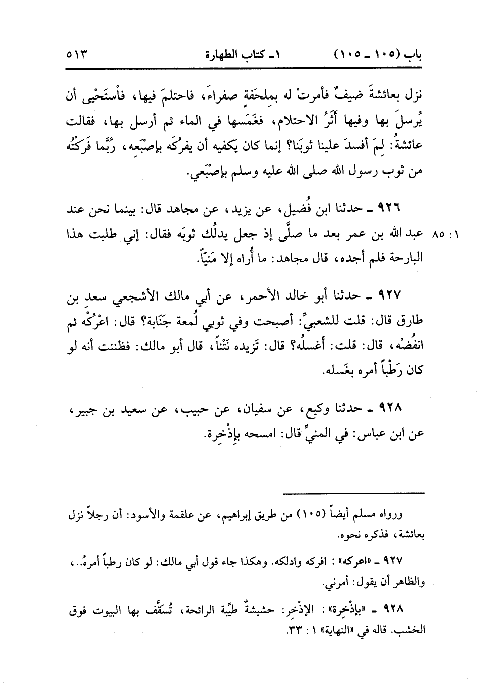 928- حَدَّثَنَا وَكِيعٌ ، عَنْ سُفْيَانَ ، عَنْ حَبِيبٍ ، عَنْ سَعِيدِ بْنِ جُبَيْرٍ ، عَنِ ابْنِ عَبَّاسٍ ؛ فِي الْمَنِيِّ قَالَ : امْسَحْهُ بِإِذْخِرَةٍ. (1/85).