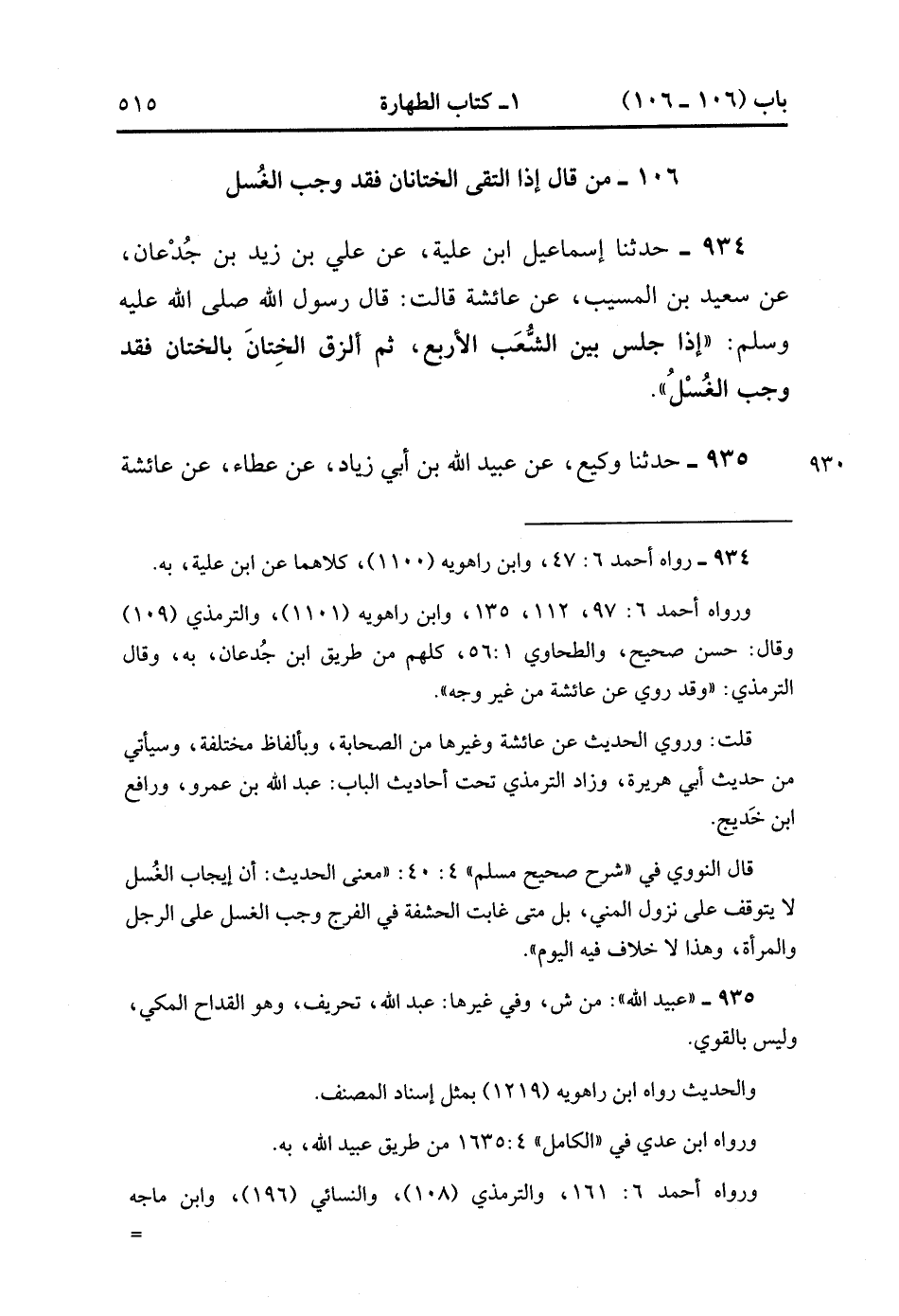 934- حَدَّثَنَا إسْمَاعِيلُ ابْنُ عُلَيَّةَ ، عَنْ عَلِيِّ بْنِ زَيْدِ بْنِ جُدْعَانَ ، عَنْ سَعِيدِ بْنِ الْمُسَيَّبِ ، عَنْ عَائِشَةَ قَالَتْ : قَالَ رَسُولُ اللهِ صَلَّى الله عَلَيْهِ وَسَلَّمَ : إذَا جَلَسَ بَيْنَ الشُّعَبِ الأَرْبَعِ ، ثُمَّ أَلْزَقَ الْخِتَانَ بِالْخِتَانِ ، فَقَدْ وَجَبَ الْغُسْلُ. (1/85).