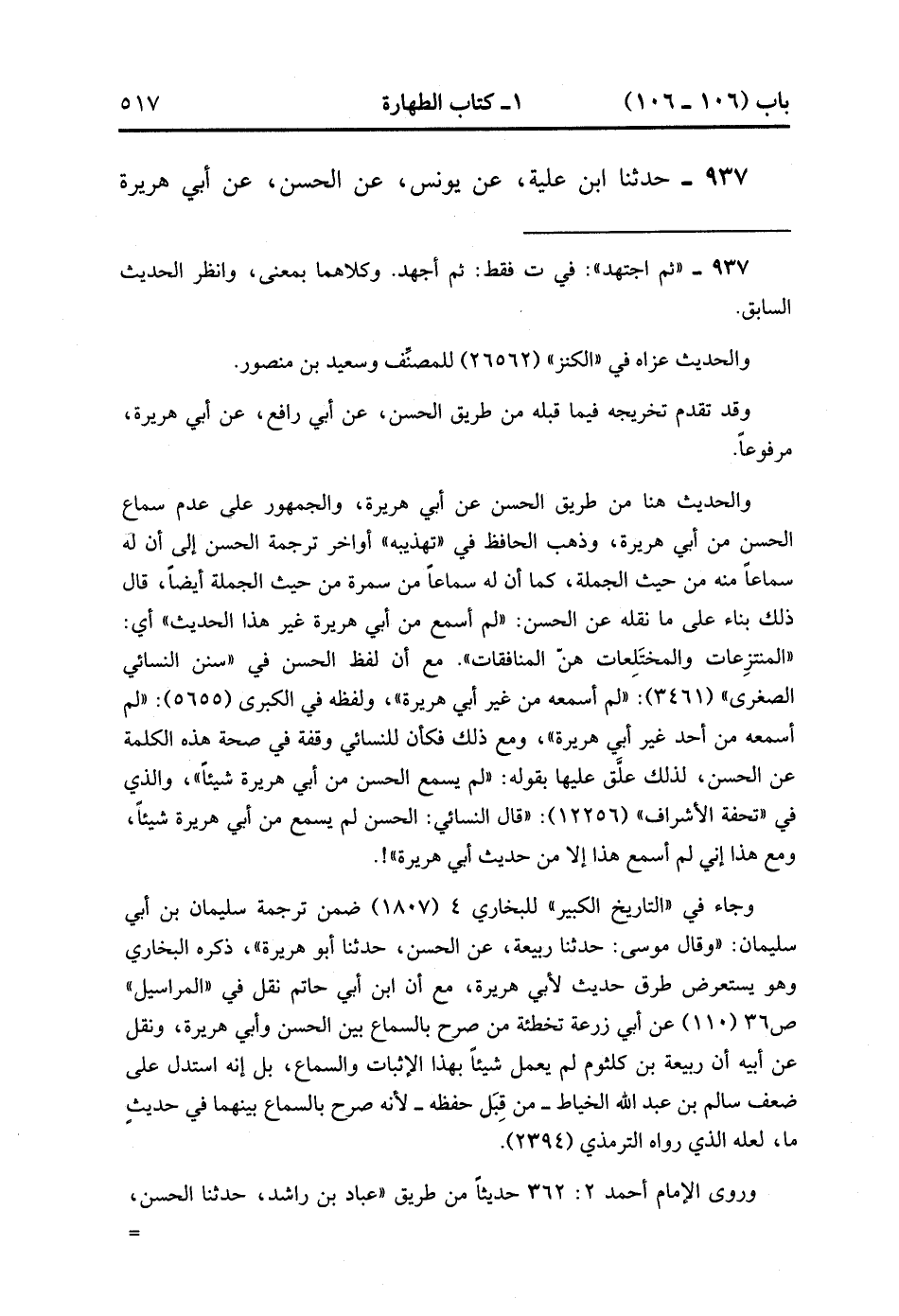 937- حَدَّثَنَا ابْنُ عُلَيَّةَ ، عَنْ يُونُسَ ، عَنِ الْحَسَنِ ، عَنْ أَبِي هُرَيْرَةَ - قَالَ يُونُسُ : وَلا أَعْلَمُهُ إِلاَّ قَدْ رَفَعَهُ - قَالَ : إذَا جَلَسَ بَيْنَ فُرُوجِهَا الأَرْبَعِ ، ثُمَّ اجْتَهَدَ وَجَبَ الْغُسْلُ ، أَنْزَلَ أَوْ لَمْ يُنْزِلْ. (1/86).