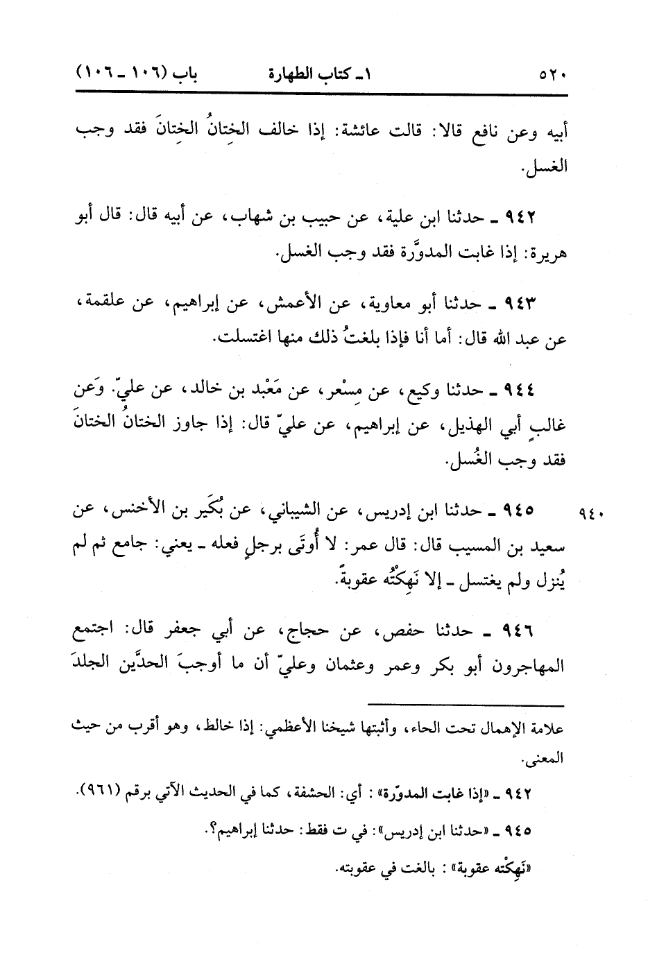 945- حَدَّثَنَا ابْنُ إدْرِيسَ ، عَنِ الشَّيْبَانِيِّ ، عَنْ بُكَيْرِ بْنِ الأَخْنَسِ ، عَنْ سَعِيدِ بْنِ الْمُسَيَّبِ ، قَالَ : قَالَ عُمَرُ : لا أُوتِيَ بِرَجُلٍ فَعَلَهُ - يَعْنِي : جَامَعَ ثُمَّ لَمْ يُنْزِلْ وَلَمْ يَغْتَسِلْ - إِلاَّ نَهِكْتُه عُقُوبَةً.