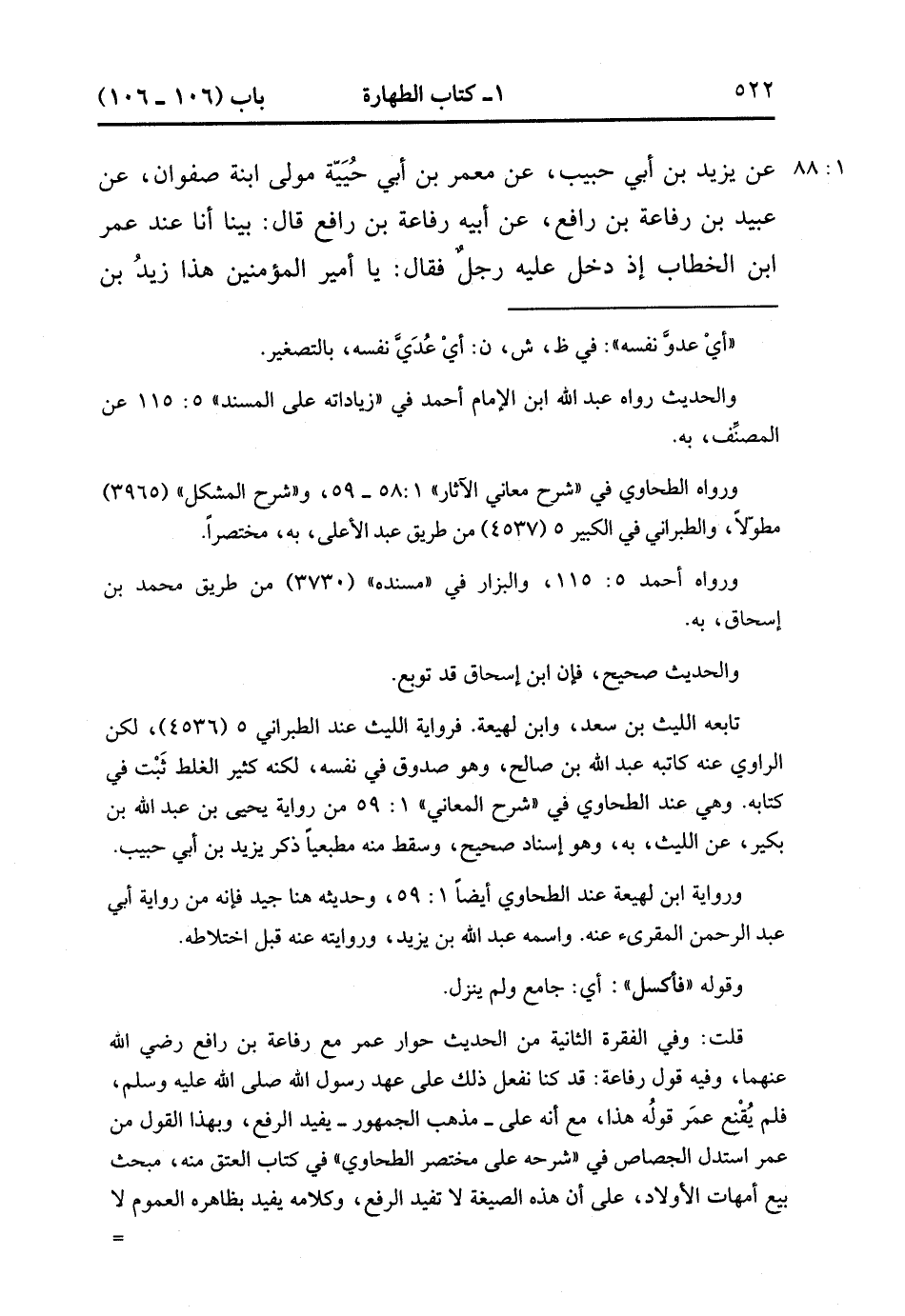 952- حَدَّثَنَا عَبْدُ الأَعْلَى بْنُ عَبْدِ الأَعْلَى ، عَنْ مُحَمَّدِ بْنِ إِسْحَاق ، عَنْ يَزِيدَ بْنِ أَبِي حَبِيبٍ ، عَنْ مَعْمَرِ بْنِ أَبِي حُيَيَّةَ ، مَوْلَى ابْنَةِ صَفْوَانَ ، عَنْ عُبَيْدِ بْنِ رِفَاعَةَ بْنِ رَافِعٍ ، عَنْ أَبِيهِ رِفَاعَةَ بْنِ رَافِعٍ ؛ قَالَ : بَيْنَا أَنَا عِنْدَ عُمَرَ بْنِ الْخَطَّابِ إذْ دَخَلَ عَلَيْهِ رَجُلٌ ، فَقَالَ : يَا أَمِيرَ الْمُؤْمِنِينَ ، هَذَا زَيْدُ بْنُ ثَابِتٍ يُفْتِي النَّاسَ فِي الْمَسْجِدِ بِرَأْيِهِ فِي الْغُسْلِ مِنَ الْجَنَابَةِ ، فَقَالَ عُمَرُ : عَلَيَّ بِهِ ، فَجَاءَ زَيْدٌ ، فَلَمَّا رَآهُ عُمَرُ قَالَ : أَيْ عَدُوَّ نَفْسِهِ ، قَدْ بَلَغْتَ أَنْ تُفْتِيَ النَّاسَ بِرَأْيِكَ ؟ فَقَالَ : يَا أَمِيرَ الْمُؤْمِنِينَ ، بِاللَّهِ مَا فَعَلْتُ ، ولَكِنِّي سَمِعْتُ مِنْ أَعْمَامِي حَدِيثًا فَحَدَّثْتُ بِهِ ؛ مِنْ أَبِي أَيُّوبَ ، وَمِنْ أُبَيِّ بْنِ كَعْبٍ ، وَمِنْ رِفَاعَةَ بْنِ رَافِعٍ ، فَأَقْبَلَ عُمَرُ عَلَى رِفَاعَةَ بْنِ رَافِعٍ فَقَالَ : وَقَدْ كُنْتُمْ تَفْعَلُونَ ذَلِكَ إذَا أَصَابَ أَحَدُكُمْ مِنَ الْمَرْأَةِ فَأَكْسَلَ لَمْ يَغْتَسِلْ ؟! فَقَالَ : قَدْ كُنَّا نَفْعَلُ ذَلِكَ عَلَى عَهْدِ رَسُولِ اللهِ صَلَّى الله عَلَيْهِ وَسَلَّمَ ، فَلَمْ يَأْتِنَا مِنَ اللهِ فِيهِ تَحْرِيمٌ ، وَلَمْ يَكُنْ مِنْ رَسُولِ اللهِ صَلَّى الله عَلَيْهِ وَسَلَّمَ فِيهِ نَهْيٌ ، قَالَ : ورَسُولُ اللهِ صَلَّى الله عَلَيْهِ وَسَلَّمَ يَعْلَمُ ذَاكَ ؟ قَالَ : لا أَدْرِي ، فَأَمَرَ عُمَرُ بِجَمْعِ الْمُهَاجِرِينَ وَالأَنْصَارِ ، فَجُمِعُوا لَهُ ، فَشَاوَرَهُمْ فَأَشَارَ النَّاسُ ، أَنْ لا غُسْلَ فِي ذَلِكَ ، إِلاَّ مَا كَانَ مِنْ مُعَاذٍ وَعَلِيٍّ ، فَإِنَّهُمَا قَالاَ : إذَا جَاوَزَ الْخِتَانُ الْخِتَانَ فَقَدْ وَجَبَ الْغُسْلُ ، فَقَالَ عُمَرُ : هَذَا وَأَنْتُمْ أَصْحَابُ بَدْرٍ وَقَدِ اخْتَلَفْتُمْ ، فَمَنْ بَعْدَكُمْ أَشَدُّ اخْتِلاَفًا ، قَالَ : فَقَالَ عَلِيٌّ : يَا أَمِيرَ الْمُؤْمِنِينَ ، إِنَّهُ لَيْسَ أَحَدٌ أَعْلَمَ بِهَذَا مِنْ شَأْنِ رَسُولِ اللهِ صَلَّى الله عَلَيْهِ وَسَلَّمَ مِنْ أَزْوَاجِهِ ، فَأَرْسَلَ إلَى حَفْصَةَ فَقَالَتْ : لا عِلْمَ لِي بِهَذَا ، فَأَرْسَلَ إلَى عَائِشَةَ فَقَالَتْ : إذَا جَاوَزَ الْخِتَانُ الْخِتَانَ فَقَدْ وَجَبَ الْغُسْلُ ، فَقَالَ عُمَرُ : لا أَسْمَعُ بِرَجُلٍ فَعَلَ ذَلِكَ إِلاَّ أَوْجَعْتُهُ ضَرْبًا.(1/87).
