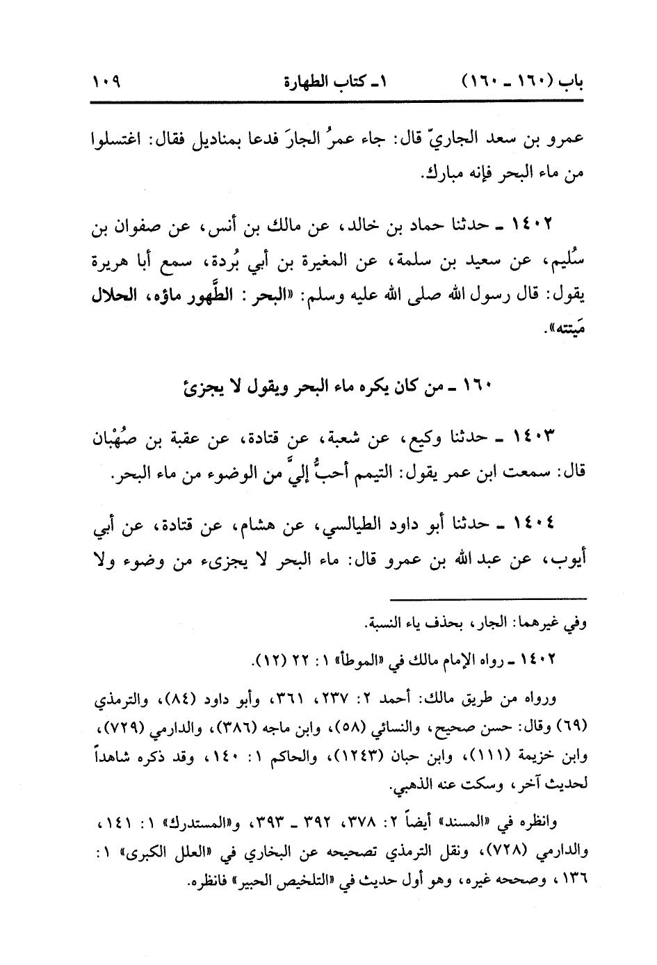 1402- حَدَّثَنَا حَمَّادُ بْنُ خَالِدٍ ، عَنْ مَالِكِ بْنِ أَنَسٍ ، عَنْ صَفْوَانَ بْنِ سُلَيْمٍ ، عَنْ سَعِيدِ بْنِ سَلَمَةَ ، عَنِ الْمُغِيرَةِ بْنِ أَبِي بُرْدَةَ سَمِعَ أَبَا هُرَيْرَةَ يَقُولُ : قَالَ رَسُولُ اللهِ صَلَّى الله عَلَيْهِ وَسَلَّمَ : الْبَحْرُ الطَّهُورُ مَاؤُهُ ، الْحَلاَلُ مَيْتَتُهُ.