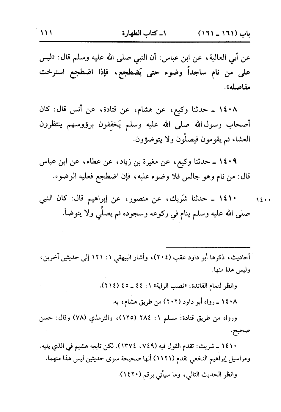 1408- حَدَّثَنَا وَكِيعٌ ، عَنْ هِشَامٍ ، عَنْ قَتَادَةَ ، عَنْ أَنَسٍ ، قَالَ : كَانَ أَصْحَابُ رَسُولِ اللهِ صَلَّى الله عَلَيْهِ وَسَلَّمَ يَخْفِقُونَ بِرُؤُوسِهِمْ يَنْتَظِرُونَ الْعِشَاءَ ، ثُمَّ يَقُومُونَ فَيُصَلُّونَ وَلا يَتَوَضَّؤُونَ.