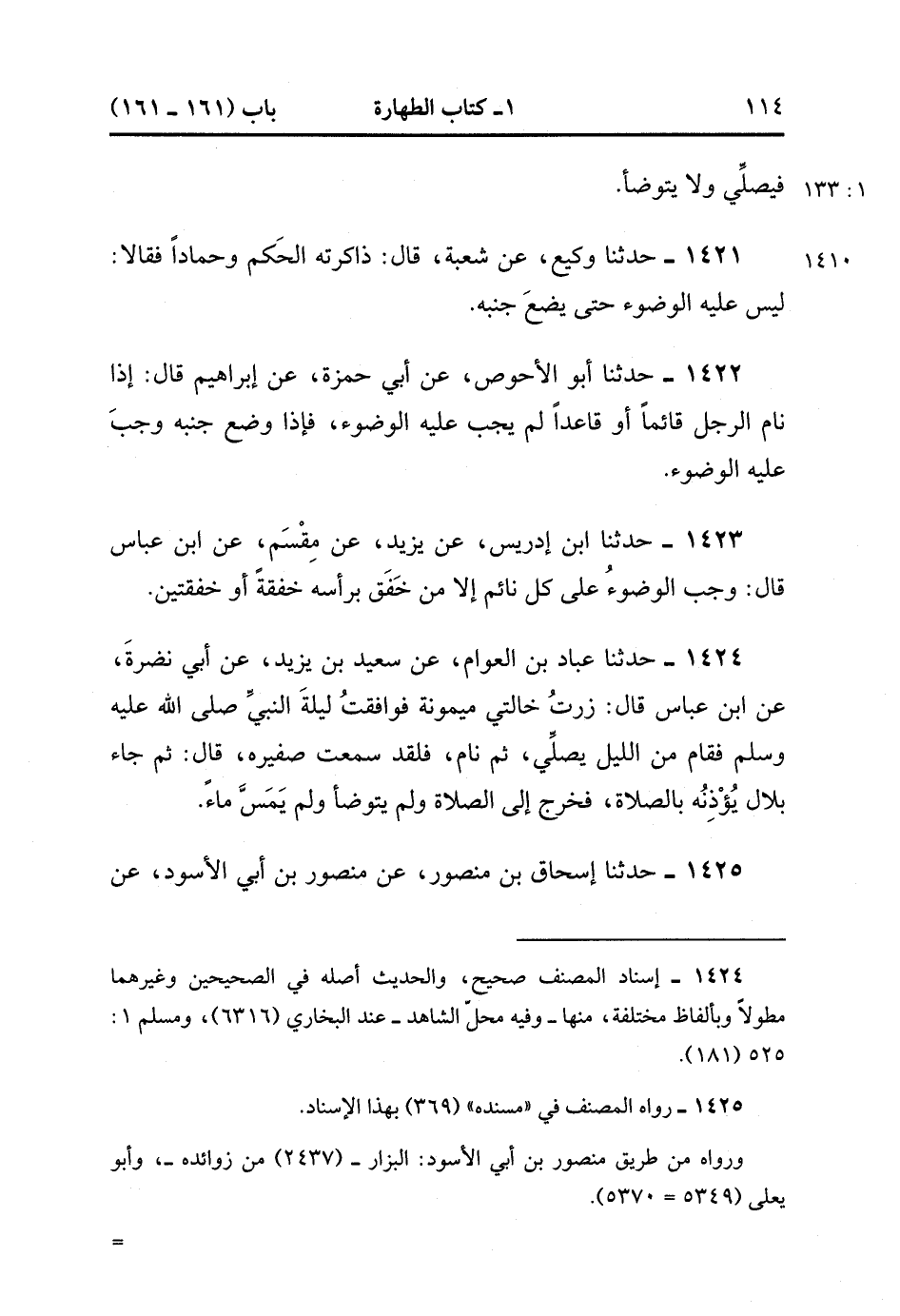 1425- حَدَّثَنَا إِسْحَاقُ بْنُ مَنْصُورٍ ، عَنْ مَنْصُورِ بْنِ أَبِي الأَسْوَدِ ، عَنِ الأَعْمَشِ ، عَنْ إِبْرَاهِيمَ ، عَنْ عَلْقَمَةَ ، عَنْ عَبْدِ اللهِ ، قَالَ : كَانَ النَّبِيُّ صَلَّى الله عَلَيْهِ وَسَلَّمَ يَنَامُ وَهُوَ سَاجِدٌ ، فَمَا نَعْرِفُ نَوْمُهُ إِلاَّ بِنَفْخِهِ ، ثُمَّ يَقُومُ فَيَمْضِي فِي صَلاَتِهِ. (1/133).