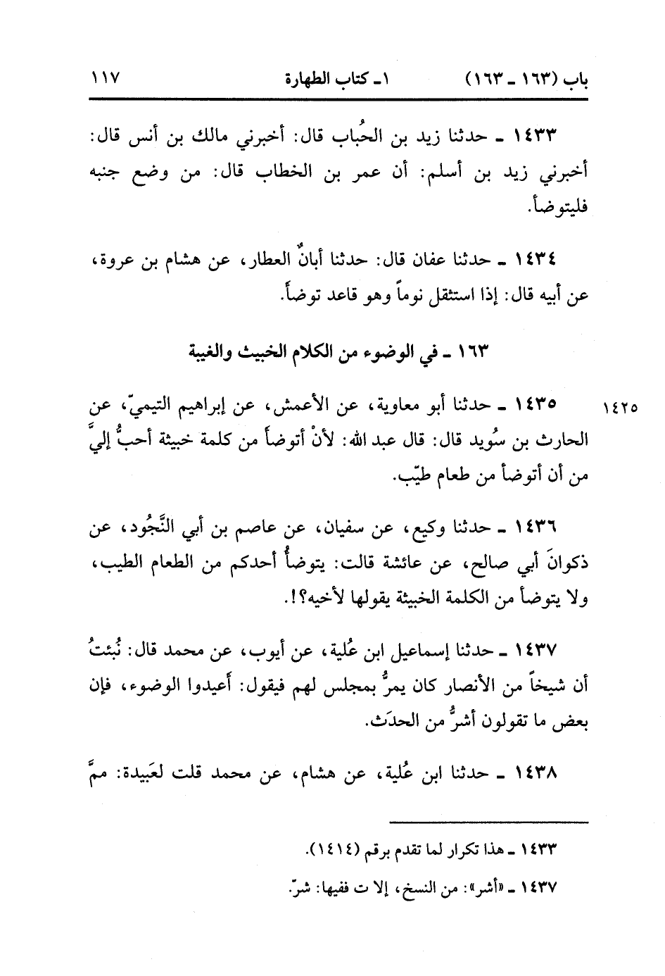 1438- حَدَّثَنَا ابْنُ عُلَيَّةَ ، عَنْ هِشَامٍ ، عَنْ مُحَمَّدٍ قُلْتُ لِعَبِيدَةَ : مِمَّا يُعَادُ الْوُضُوءُ ؟ قَالَ : مِنَ الْحَدَثِ وَأَذَى الْمُسْلِمِ. (1/134).