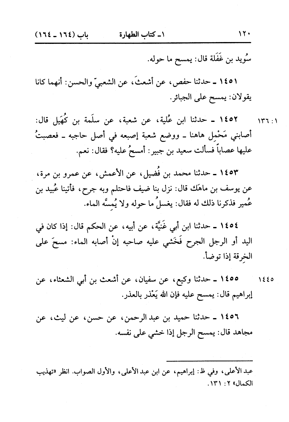 1452- حَدَّثَنَا ابْنُ عُلَيَّةَ ، عَنْ شُعْبَةَ ، عَنْ سَلَمَةَ بْنِ كُهَيْلٍ ، قَالَ : أَصَابَنِي مَحْمَلٌ هَاهُنَا - وَوَضَعَ شُعْبَةَ إصْبَعَهُ فِي أَصْلِ حَاجِبِهِ - فَعَصَبْتُ عَلَيْهِ عِصَابًا ، فَسَأَلْت سَعِيدَ بْنَ جُبَيْرٍ أَمْسَحُ عَلَيْهِ ؟ فَقَالَ : نَعَمْ. (1/135)