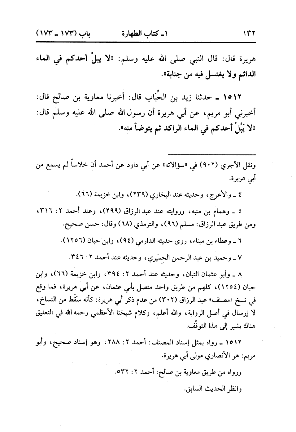 1512- حَدَّثَنَا زَيْدُ بْنُ الْحُبَابِ , قَالَ : أَخْبَرَنَا مُعَاوِيَةُ بْنُ صَالِحٍ ، قَالَ : أَخْبَرَنِي أَبُو مَرْيَمَ ، عْن أَبِي هُرَيْرَةَ ، أَنَّ رَسُولَ اللهِ صَلَّى الله عَلَيْهِ وَسَلَّمَ ، قَالَ : لا يَبُلْ أَحَدُكُمْ فِي الْمَاءِ الرَّاكِدِ ثُمَّ يَتَوَضَّأُ مِنْهُ. (1/141).