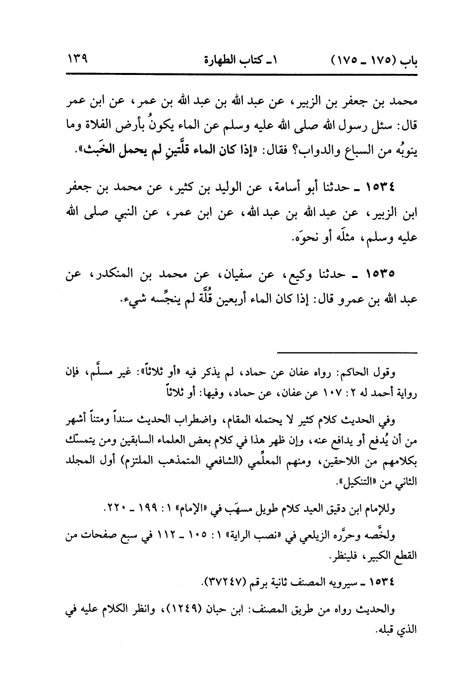 1535- حَدَّثَنَا وَكِيعٌ ، عَنْ سُفْيَانَ ، عَنْ مُحَمَّدِ بْنِ الْمُنْكَدِرِ ، عَنْ عَبْدِ اللهِ بْنِ عَمْرٍو قَالَ : إذَا كَانَ الْمَاءُ أَرْبَعِينَ قُلَّةً لَمْ يُنَجِّسْهُ شَيْءٌ. (1/144).