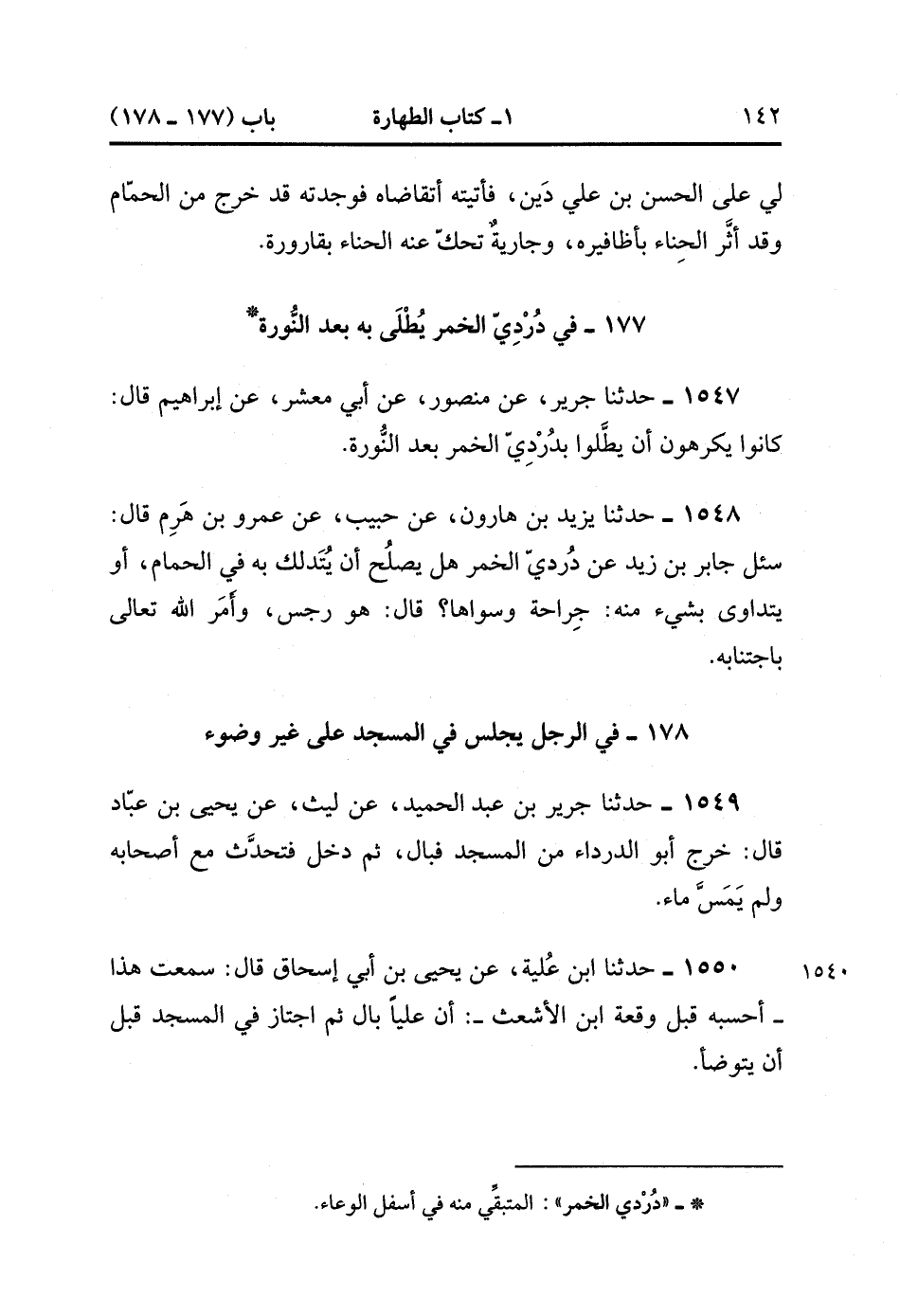 1547- حَدَّثَنَا جَرِيرٌ ، عَنْ مَنْصُورٍ ، عَنْ أَبِي مَعْشَرٍ ، عَنْ إبْرَاهِيمَ ؛ قَالَ : كَانُوا يَكْرَهُونَ أَنْ يَطَّلُوا بِدُرْدِيِّ الْخَمْرِ بَعْدَ النُّورَةِ.