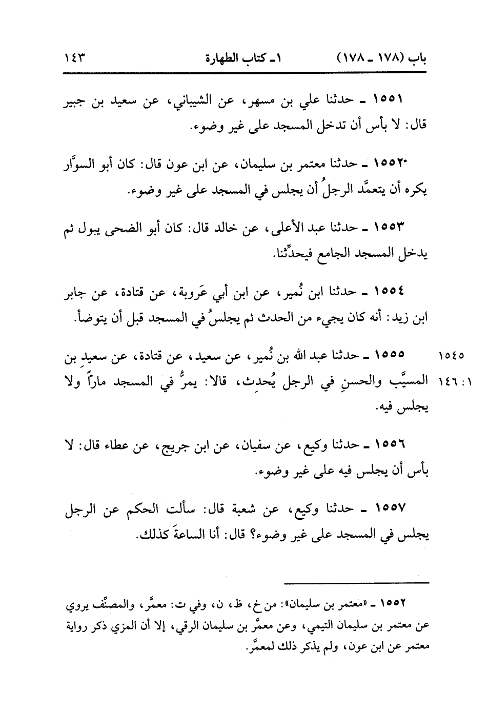 1557- حَدَّثَنَا وَكِيعٌ ، عَنْ شُعْبَةَ ، قَالَ : سَأَلْتُ الْحَكَمَ عَنِ الرَّجُلِ يَجْلِسُ فِي الْمَسْجِدِ عَلَى غَيْرِ وُضُوءٍ ؟ قَالَ : أَنَا السَّاعَةَ كَذَلِكَ. (1/146).