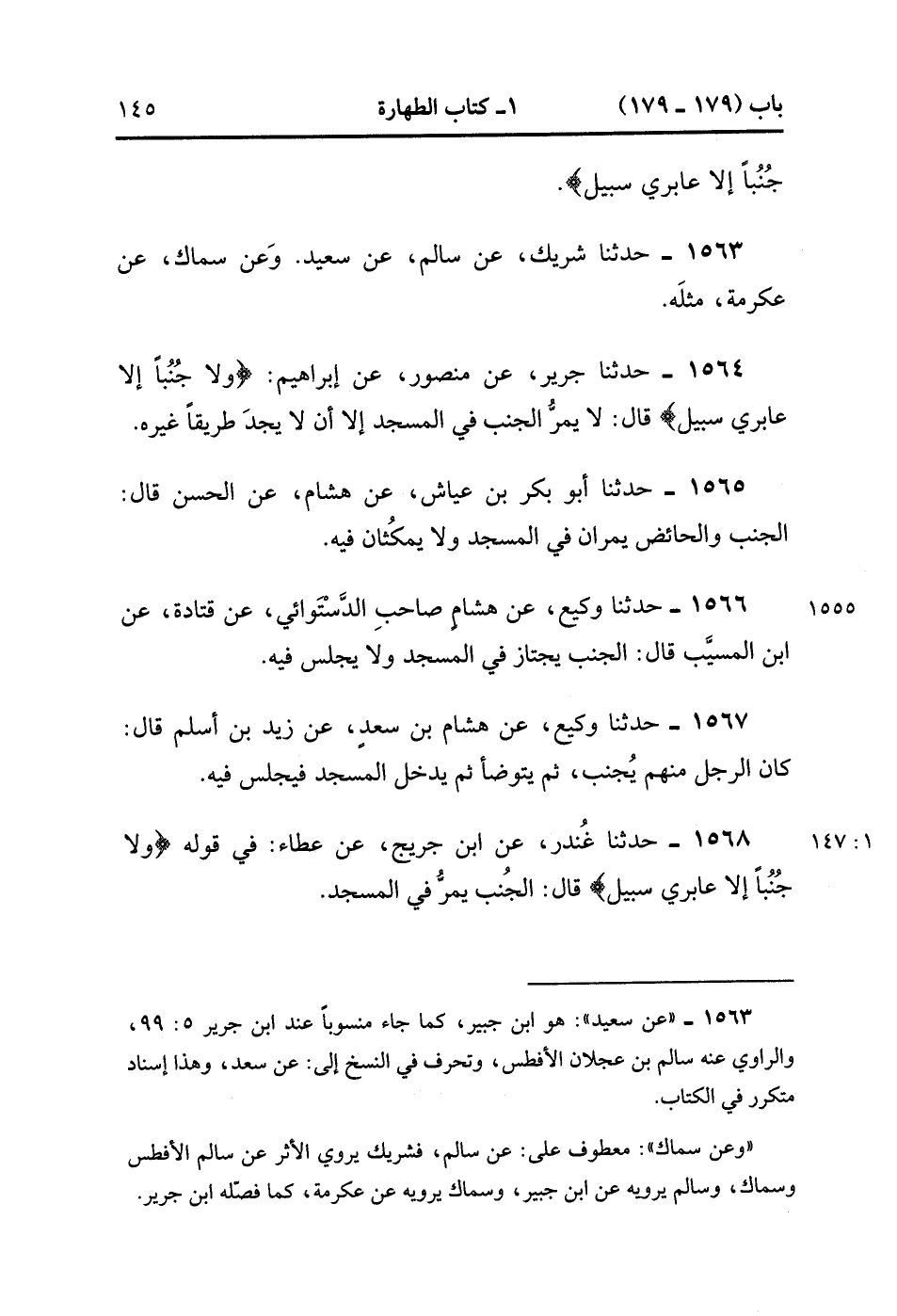 1568- حَدَّثَنَا غُنْدَرٌ ، عَنِ ابْنِ جُرَيْجٍ ، عَنْ عَطَاءٍ ؛ فِي قَوْلِهِ تَعَالَى : {وَلاَ جُنُبًا إِلاَّ عَابِرِي سَبِيلٍ} قَالَ : الْجُنُبُ يَمُرُّ فِي الْمَسْجِدِ. (1/146).