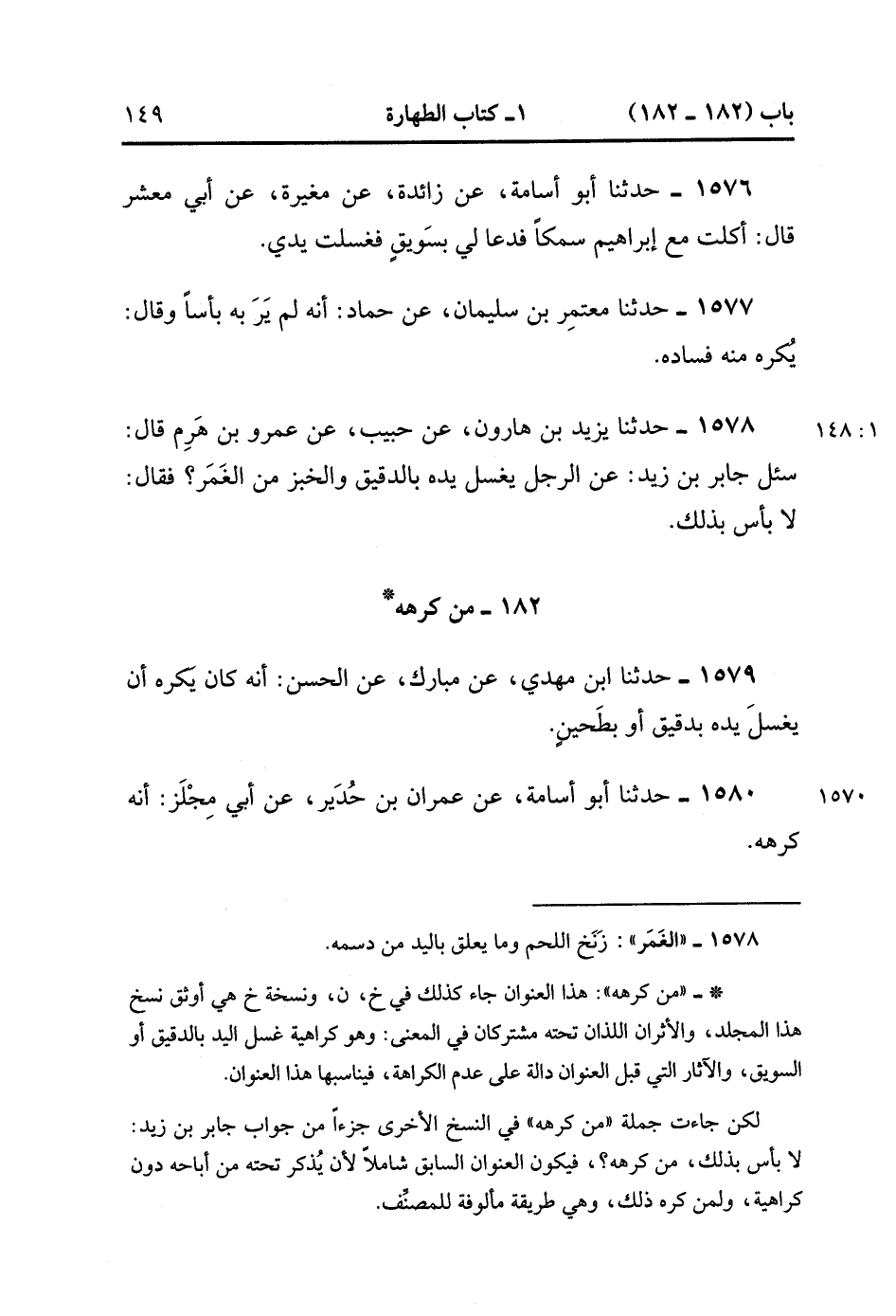 1578- حَدَّثَنَا يَزِيدُ بْنُ هَارُونَ ، عَنْ حَبِيبٍ ، عَنْ عَمْرو بْنِ هَرِمٍ ، قَالَ : سُئِلَ جَابِرُ بْنُ زَيْدٍ عَنِ الرَّجُلِ يَغْسِلُ يَدَهُ بِالدَّقِيقِ وَالْخُبْزِ مِنَ الْغَمَرِ ؟ فَقَالَ : لا بَأْسَ بِذَلِكَ.