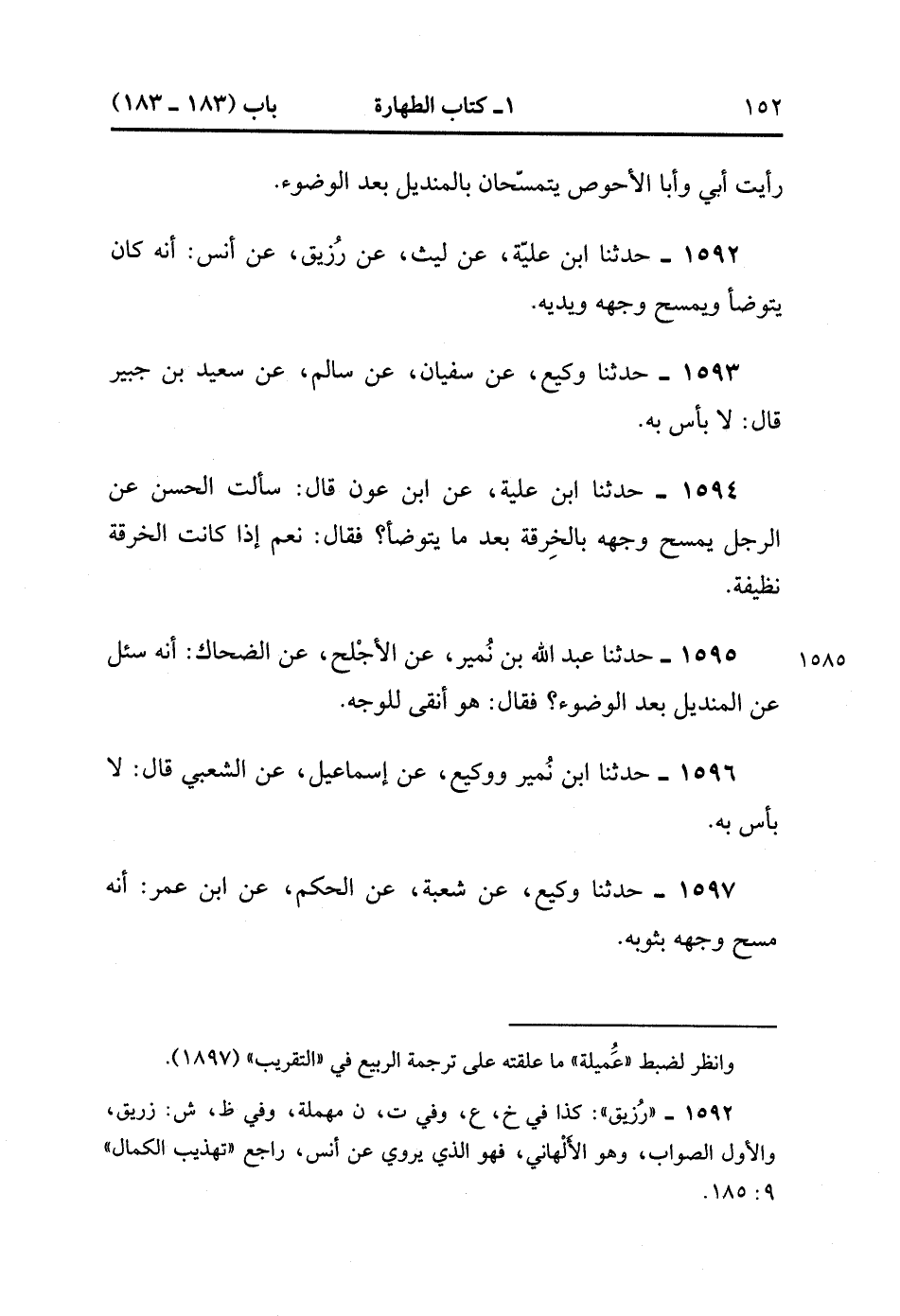 1592- حَدَّثَنَا ابْنُ عُلَيَّةَ ، عَنْ لَيْثٍ ، عَنْ رُزَيْقٍ ، عَنْ أَنَسٍ : أَنَّهُ كَانَ يَتَوَضَّأُ وَيَمْسَحُ وَجْهَهُ وَيَدَيْهِ.