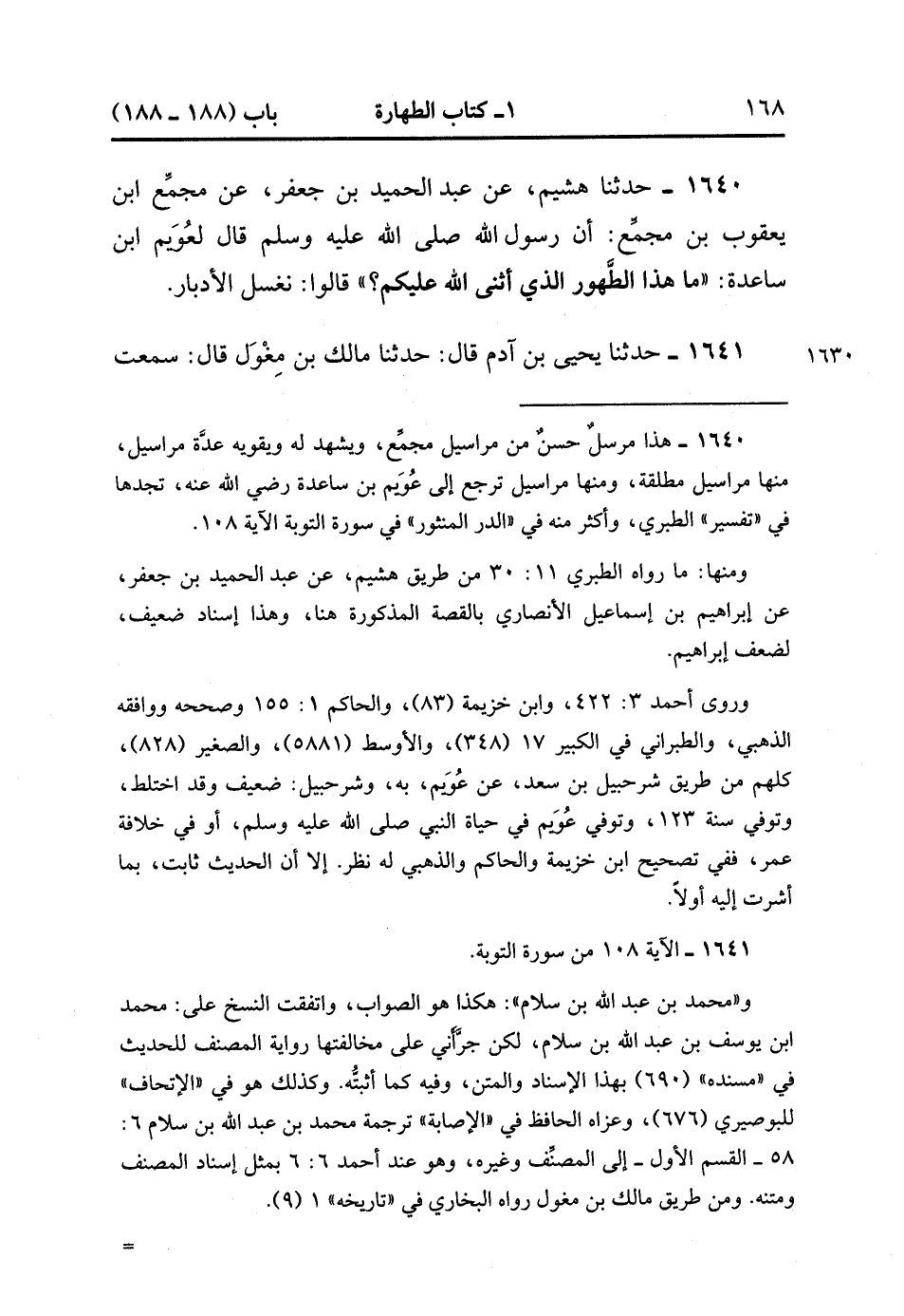 1641- حَدَّثَنَا يَحْيَى بْنُ آدَمَ , قَالَ : حدَّثَنَا مَالِكُ بْنُ مِغْوَلٍ ، قَالَ : سَمِعْتُ سَيَّارًا أَبَا الْحَكَمِ غَيْرَ مَرَّةٍ يُحَدِّثُ عَنْ شَهْرِ بْنِ حَوْشَبٍ ، عَنْ مُحَمَّدِ بْنِ عَبْدِ اللهِ بْنِ سَلاَمٍ ، قَالَ : لَمَّا قَدِمَ رَسُولُ اللهِ صَلَّى الله عَلَيْهِ وَسَلَّمَ عَلَيْنَا ، يَعْنِي : قُبَاءَ ، قَالَ : إنَّ اللَّهَ قَدْ أَثْنَى عَلَيْكُمْ فِي الطُّهُورِ خَيْرًا ، أَفَلاَ تُخْبِرُونِني ؟ قَالَ : يَعْنِي : قوله : {فِيهِ رِجَالٌ يُحِبُّونَ أَنْ يَتَطَهَّرُوا وَاللَّهُ يُحِبُّ الْمُطَّهِّرِينَ} قَالَ : فَقَالُوا : يَا رَسُولَ اللهِ ، إنَّا لَنَجِدُهُ مَكْتُوبًا عَلَيْنَا فِي التَّوْرَاةِ : الاسْتِنْجَاءُ بِالْمَاءِ. (1/153).