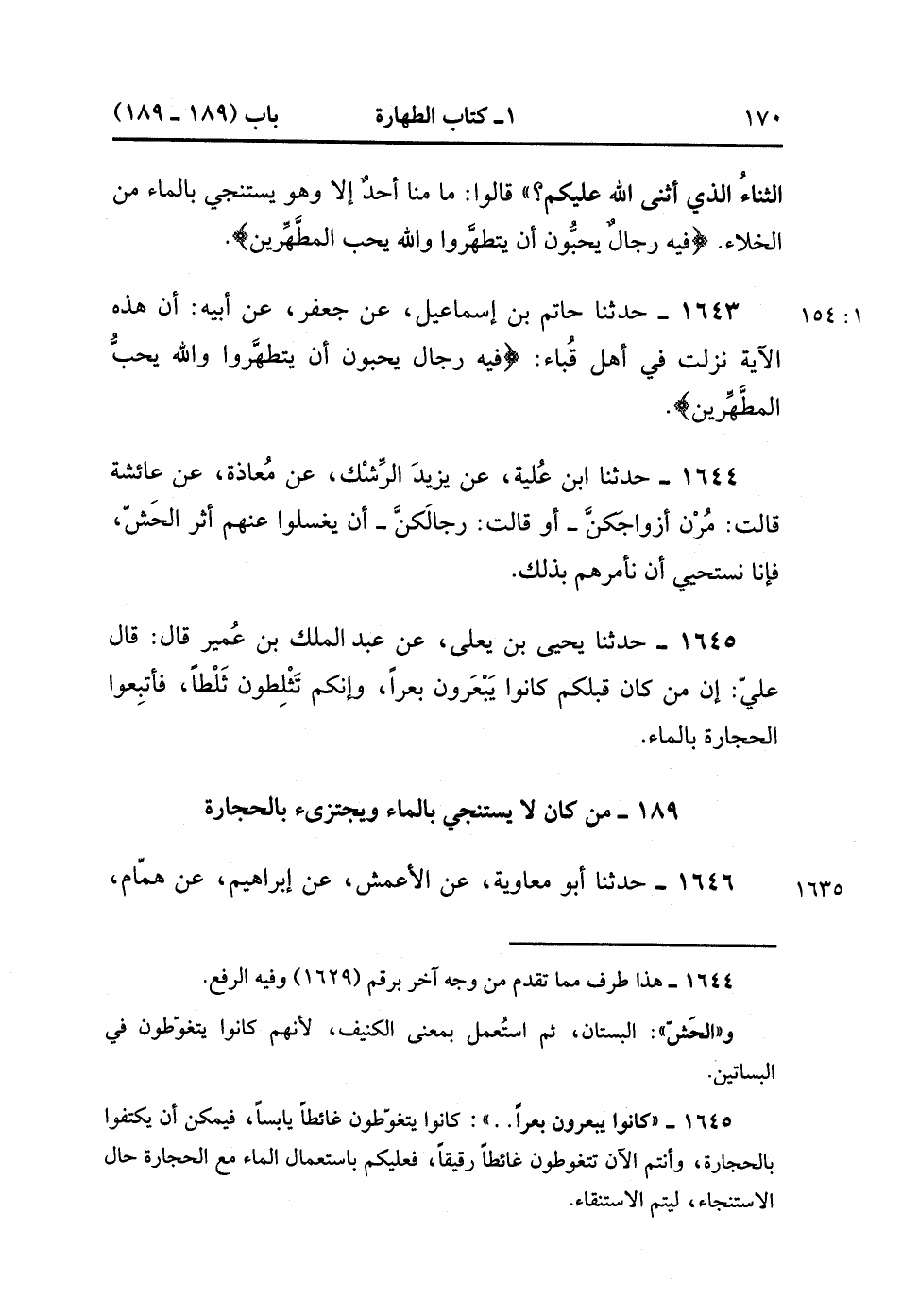 1643- حَدَّثَنَا حَاتِمُ بْنُ إسْمَاعِيلَ ، عَنْ جَعْفَرٍ ، عَنْ أَبِيهِ : أَنَّ هَذِهِ الآيَةَ نَزَلَتْ فِي أَهْلِ قُبَاءَ : {فِيهِ رِجَالٌ يُحِبُّونَ أَنْ يَتَطَهَّرُوا وَاللَّهُ يُحِبُّ الْمُطَّهِّرِينَ} . (1/153)