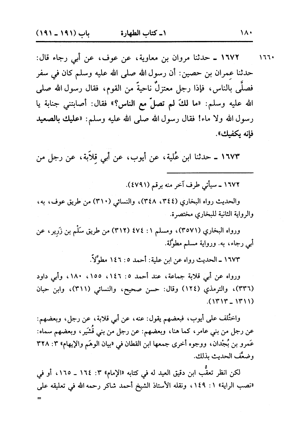 1672- حَدَّثَنَا مَرْوَانُ بْنُ مُعَاوِيَةَ ، عَنْ عَوْفٍ ، عَنْ أَبِي رَجَاءٍ , قَالَ : حدَّثَنَا عِمْرَانُ بْنُ حُصَيْنٍ ؛ أَنَّ رَسُولَ اللهِ صَلَّى الله عَلَيْهِ وَسَلَّمَ كَانَ فِي سَفَرٍ فَصَلَّى بِالنَّاسِ فَإِذَا رَجُلٌ مُعْتَزِلٌ نَاحِيَةً مِنَ الْقَوْمِ ، فَقَالَ رَسُولُ اللهِ صَلَّى الله عَلَيْهِ وَسَلَّمَ : مَا لَكَ لَمْ تُصَلِّ مَعَ النَّاسِ ؟ فَقَالَ : أَصَابَتْنِي جَنَابَةٌ يَا رَسُولَ اللهِ ، وَلا مَاءَ ، فَقَالَ رَسُولُ اللهِ صَلَّى الله عَلَيْهِ وَسَلَّمَ : عَلَيْك بِالصَّعِيدِ فَإِنَّهُ يَكْفِيك. (1/156).