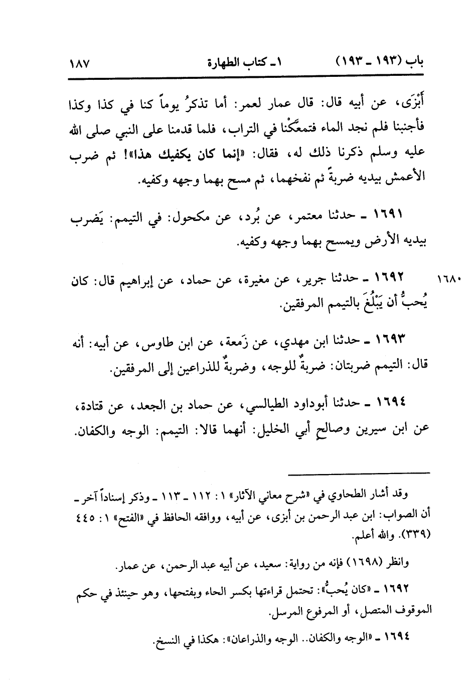 1694- حَدَّثَنَا أَبُو دَاوُدَ الطَّيَالِسِيُّ ، عَنْ حَمَّادِ بْنِ الْجَعْدِ ، عَنْ قَتَادَةَ ، عَنِ ابْنِ سِيرِينَ وَصَالِحٍ أَبِي الْخَلِيلِ أَنَّهُمَا قَالاَ : التَّيَمُّمُ الوَجْهِ وَالْكَفَّانِ. وَقَالَ سَعِيدُ بْنُ الْمُسَيَّبِ وَابْنُ عُمَرَ : الوَجْهِ وَالذِّرَاعَانِ. (1/159).