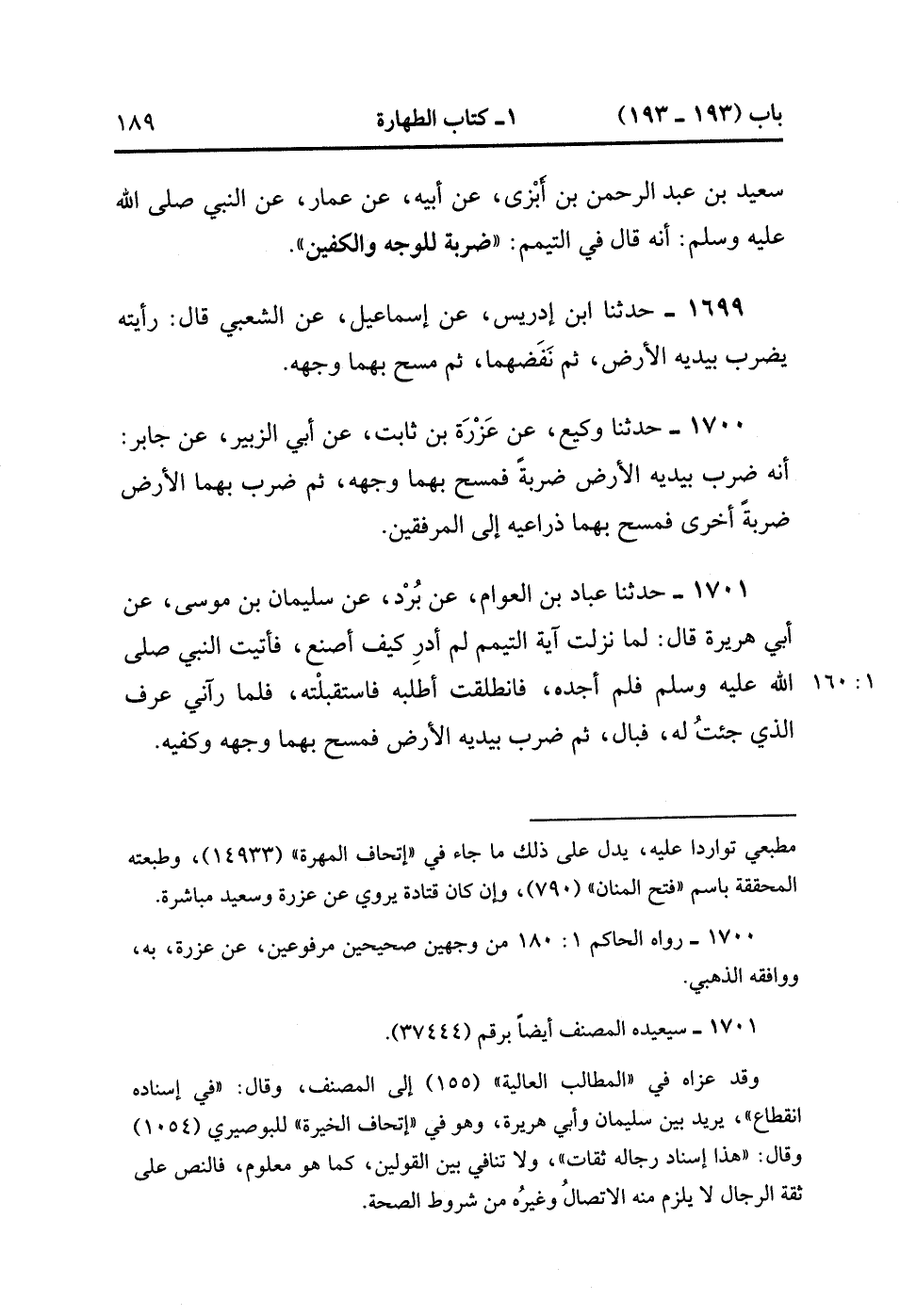1701- حَدَّثَنَا عَبَّادُ بْنُ الْعَوَّامِ ، عَنْ بُرْدٍ ، عَنْ سُلَيْمَانَ بْنِ مُوسَى ، عَنْ أَبِي هُرَيْرَةَ ، قَالَ : لَمَّا نَزَلَتْ آيَةُ التَّيَمُّمِ لَمْ أَدْرِ كَيْفَ أَصْنَعُ ، فَأَتَيْت النَّبِيَّ صَلَّى الله عَلَيْهِ وَسَلَّمَ فَلَمْ أَجِدْهُ ، فَانْطَلَقْتُ أَطْلُبُهُ فَاسْتَقْبَلْتُهُ ، فَلَمَّا رَأَني عَرَفَ الَّذِي جِئْتُ لَهُ ، فَبَالَ ، ثُمَّ ضَرَبَ بِيَدَيْهِ الأَرْضَ فَمَسَحَ بِهِمَا وَجْهَهُ وَكَفَّيْهِ. (1/159).